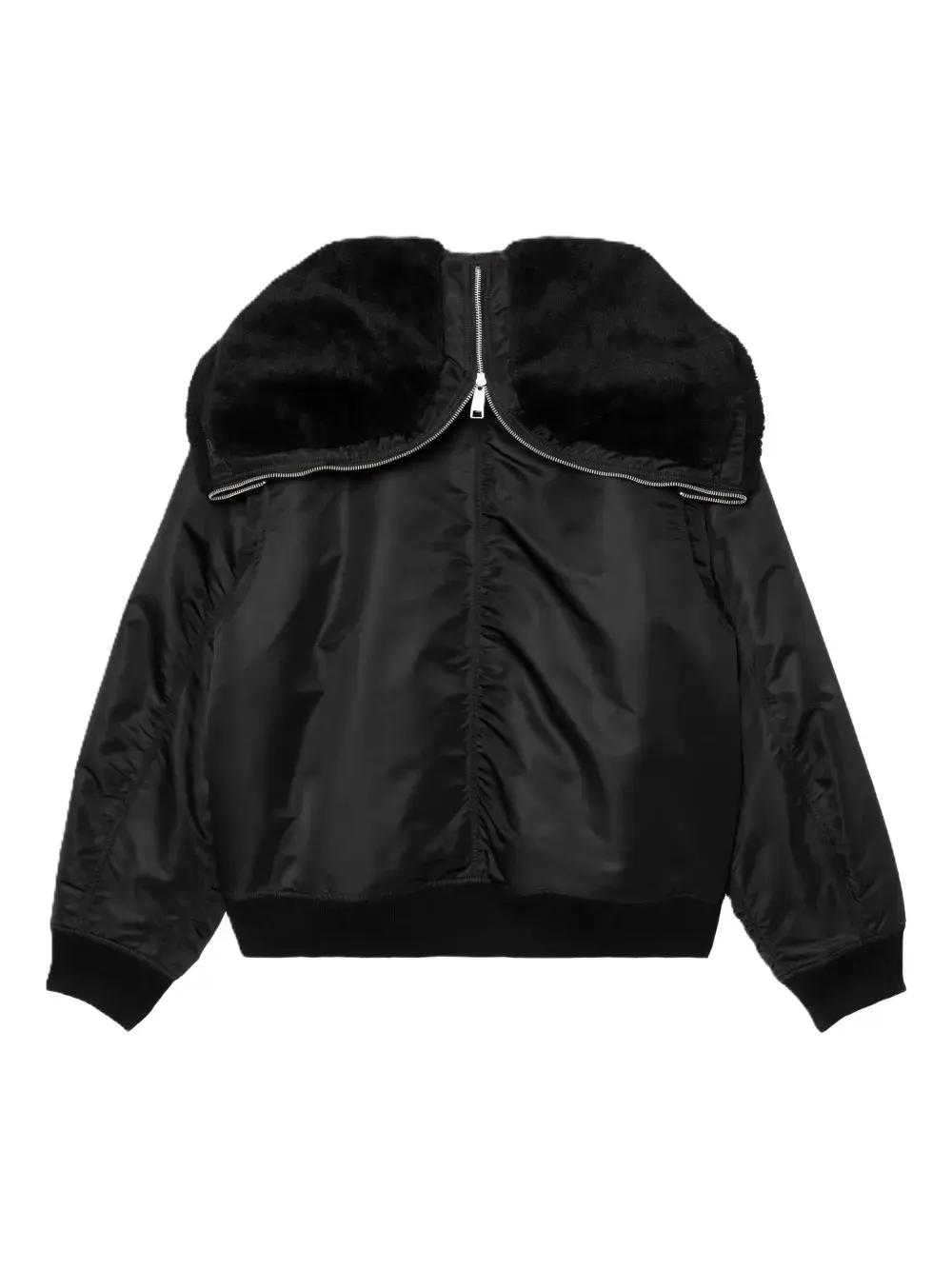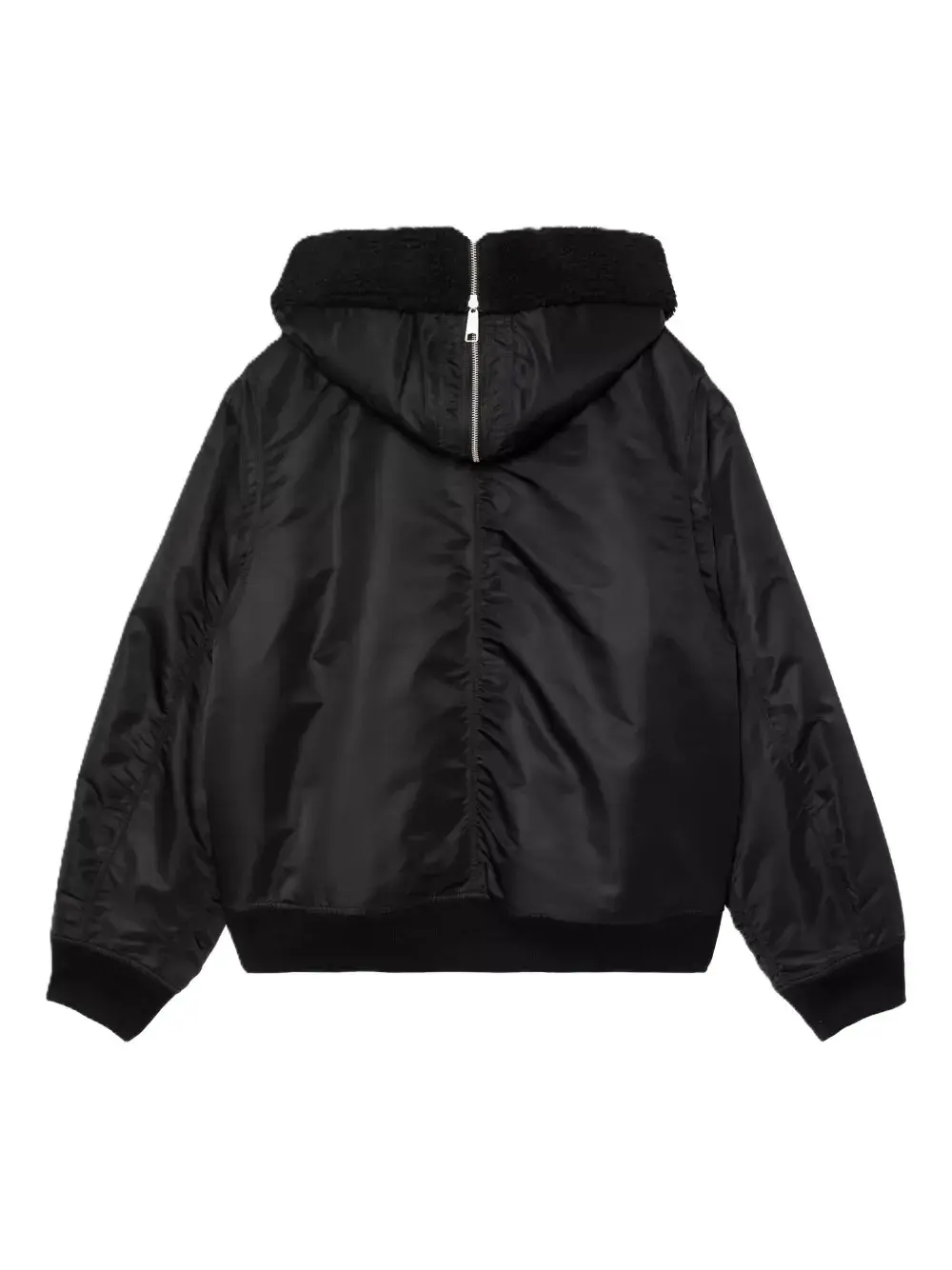 Черная куртка с отделкой из искусственного меха, капюшоном, накладными карманами спереди, карманом на рукаве на молнии, застежкой на пуговицы спереди