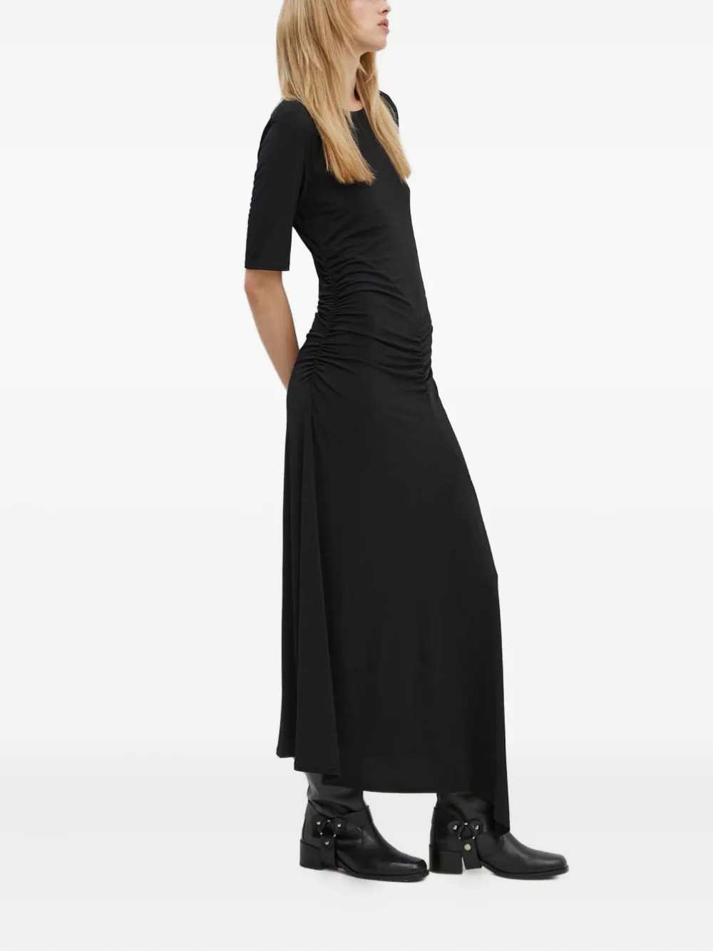 Черное платье с короткими рукавами, круглым вырезом, драпировкой и длиной макси