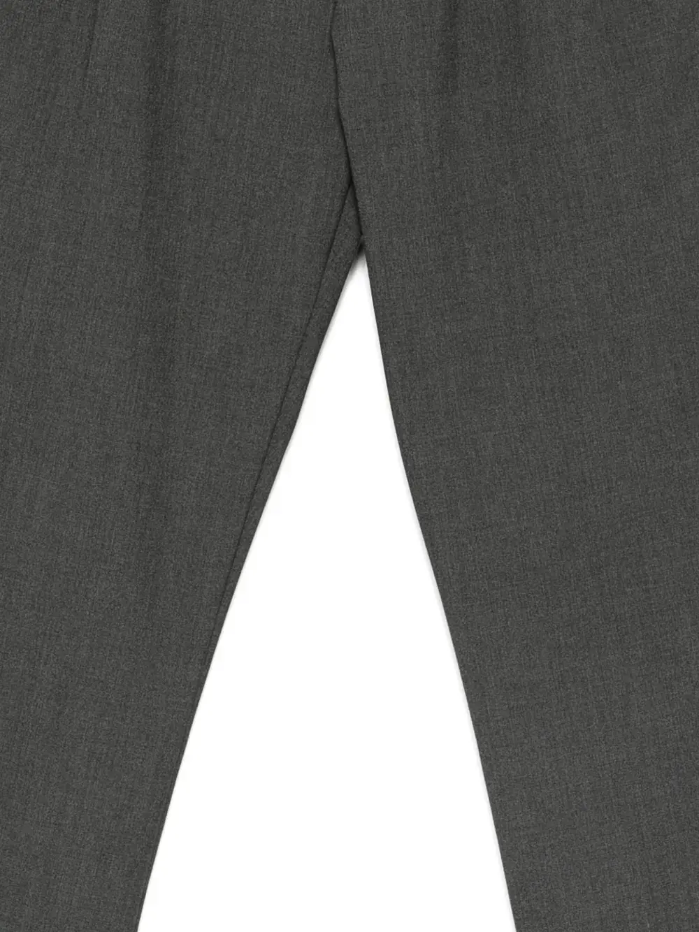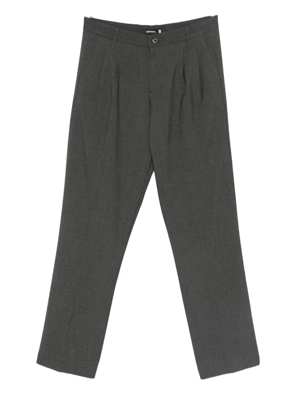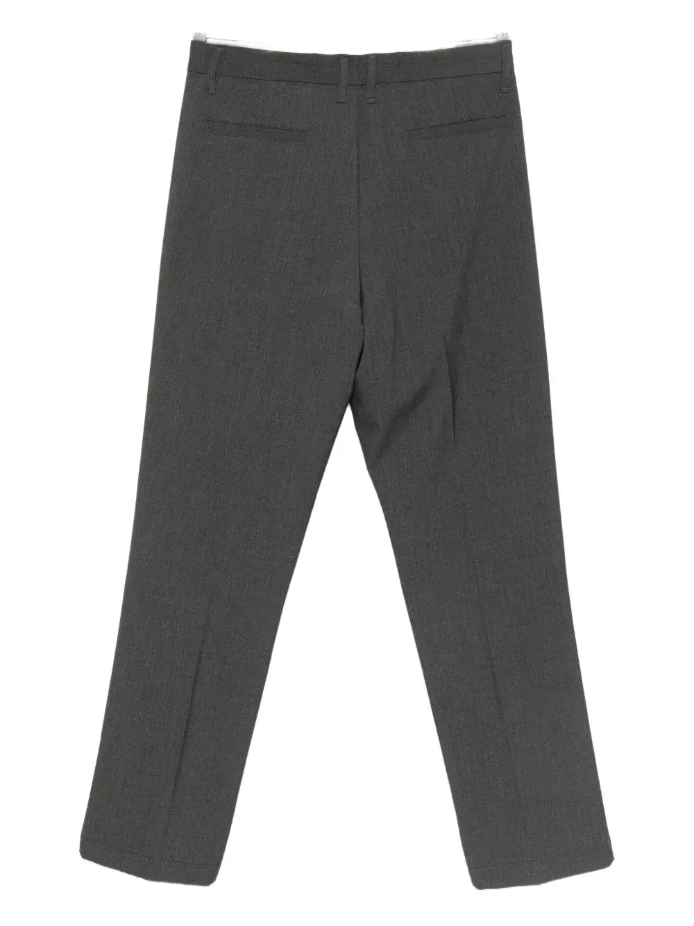 Серые, с защипами спереди, застежка на пуговицы, шлевки для ремня, прорезные карманы сзади, прямой крой