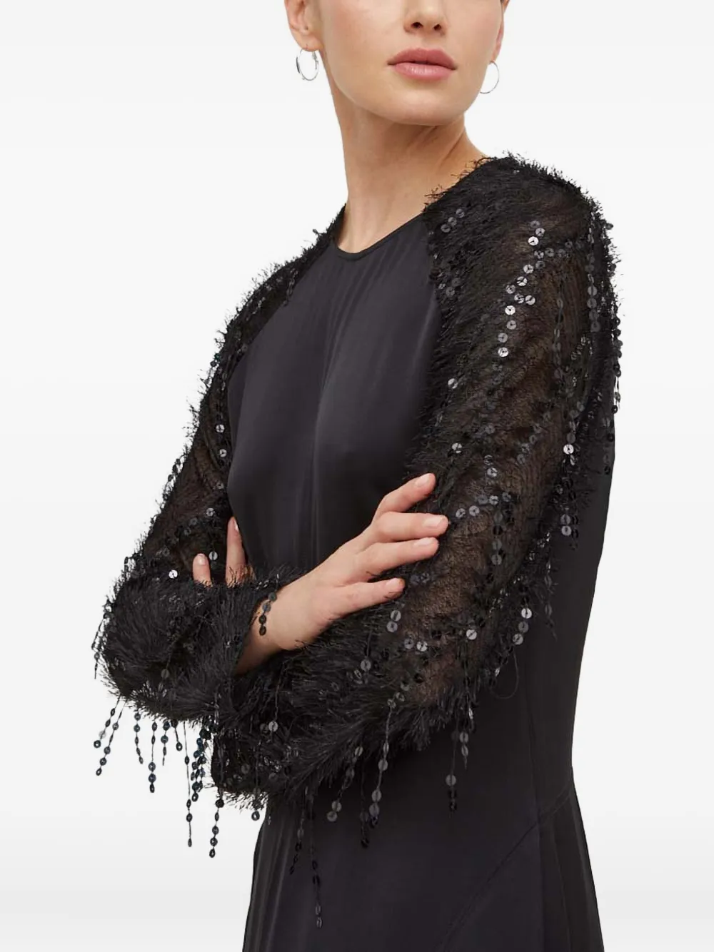 Черный топ с длинными рукавами, круглым вырезом и бахромой