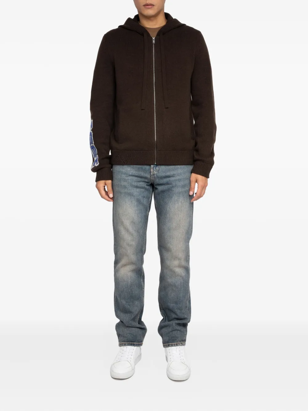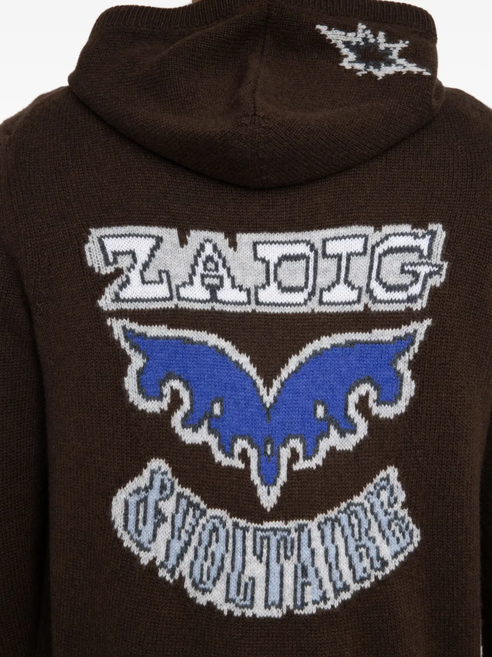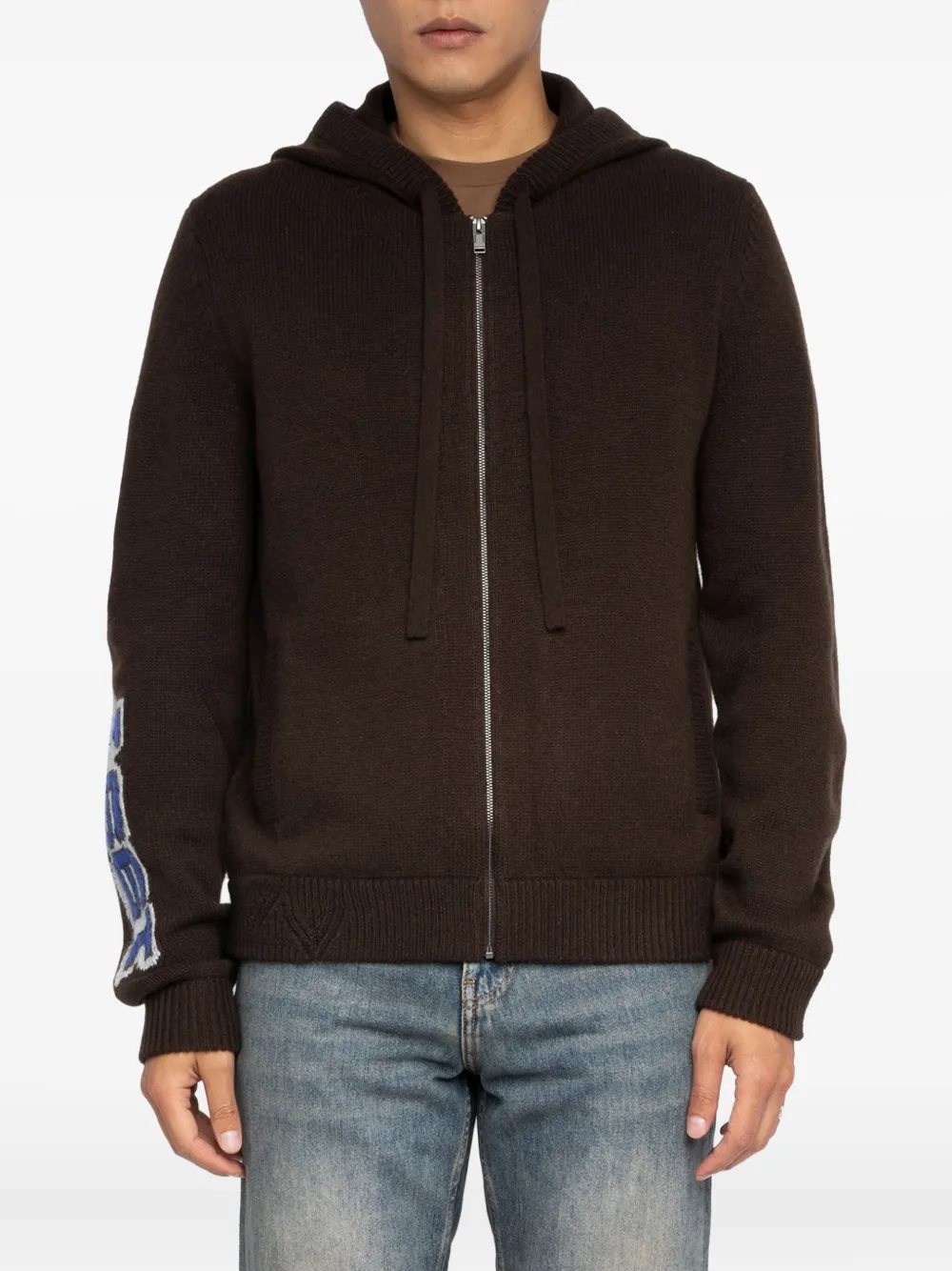 Темно-шоколадный худи на молнии, ребристые манжеты и нижний край, графика на спине