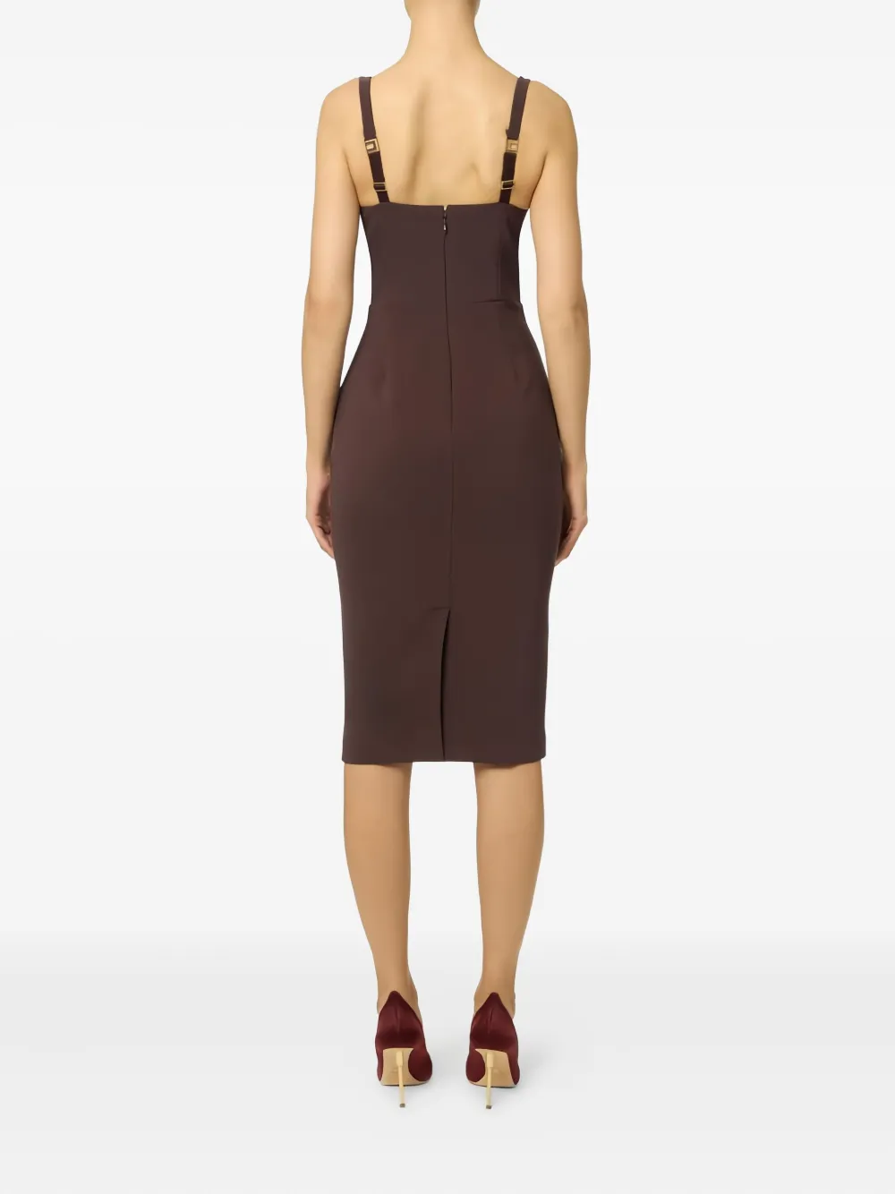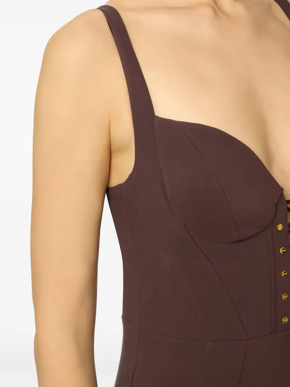 Бордово-коричневый цвет, регулируемые бретели, перекрещивающаяся шнуровка, фурнитура цвета золота, разрез сзади