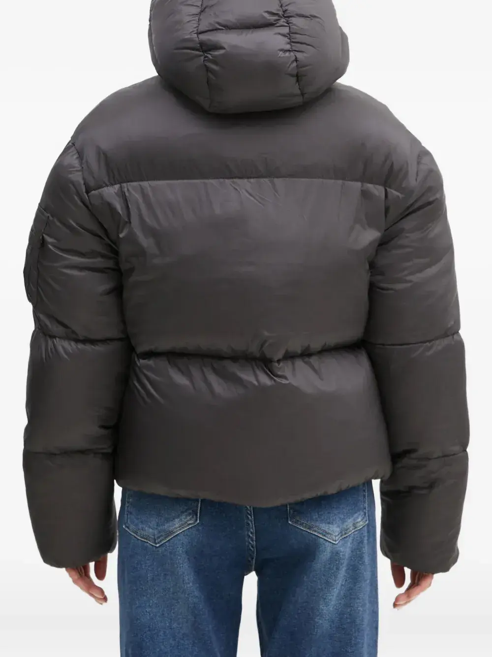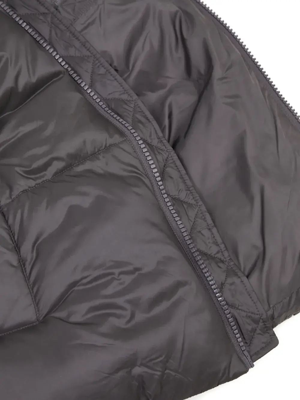 Темно-серый цвет, стеганый дизайн, капюшон, застежка-молния, боковые прорезные карманы, карман на молнии на рукаве