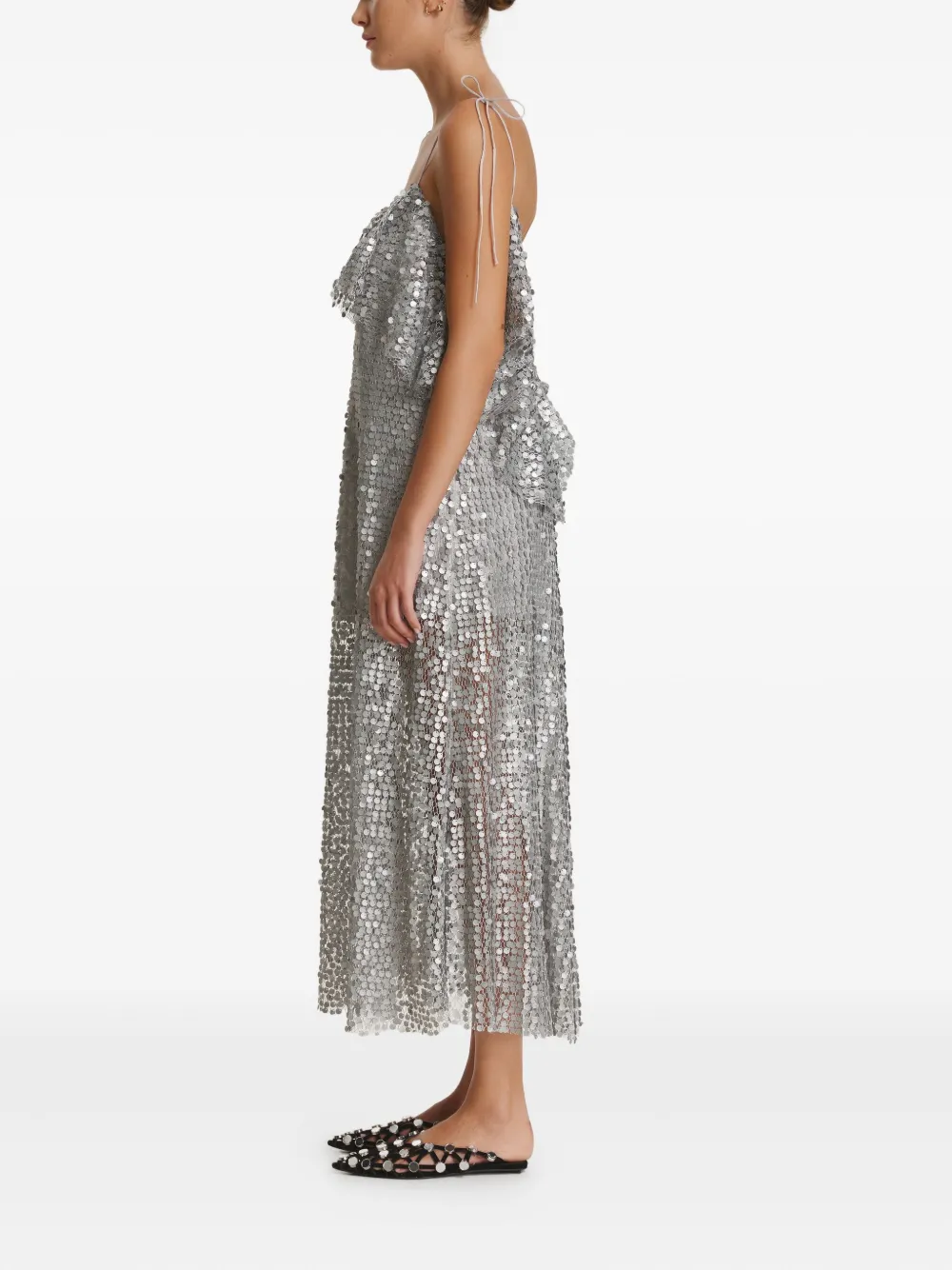 Серое платье с пайетками по всей поверхности, оборчатой отделкой, тонкими бретелями, открытой спиной и прозрачным финишем