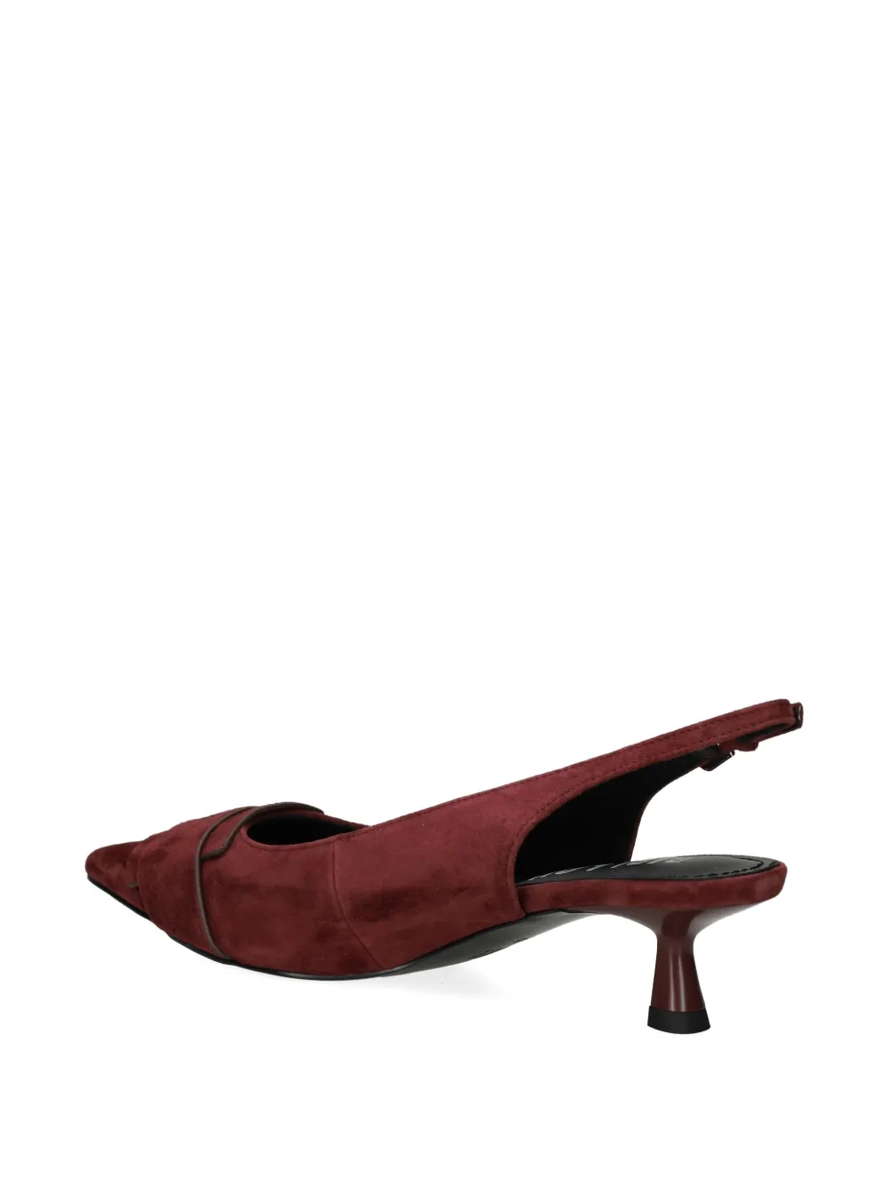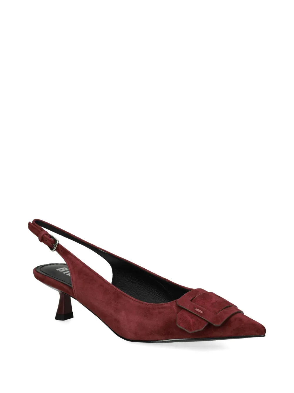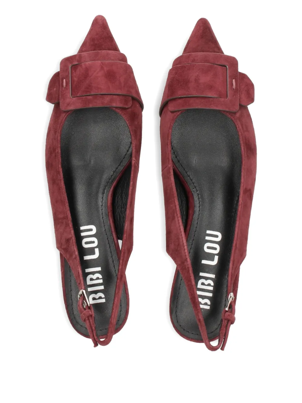 Бордовые замшевые туфли с заостренным носком, пряжкой, ремешком на пятке и низким каблуком-«рюмочка»