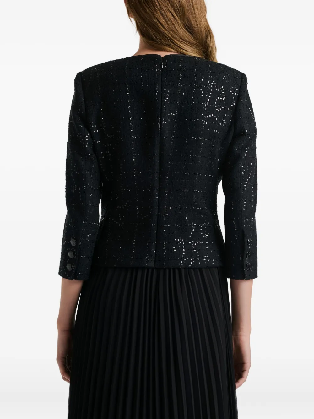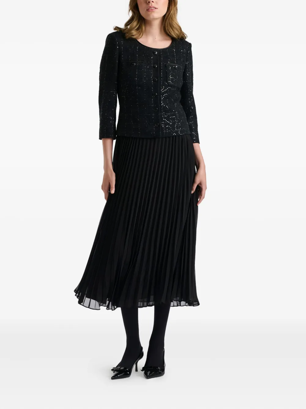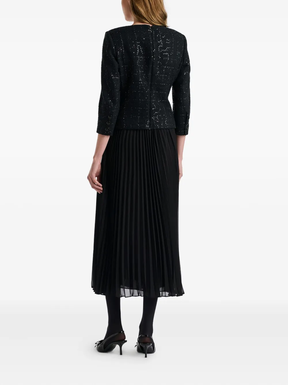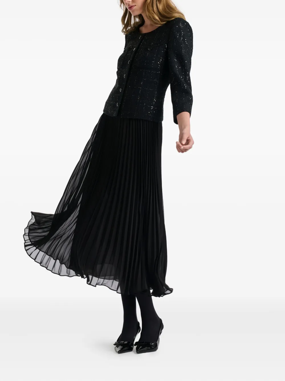 Черная плиссированная юбка, застежка на пуговицы, рукава три четверти, накладные карманы с клапанами, круглый вырез