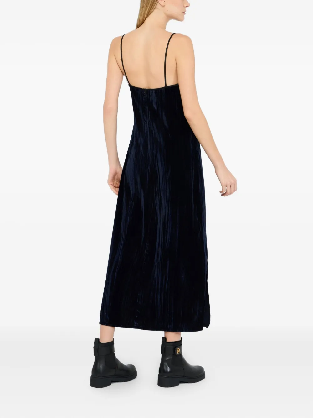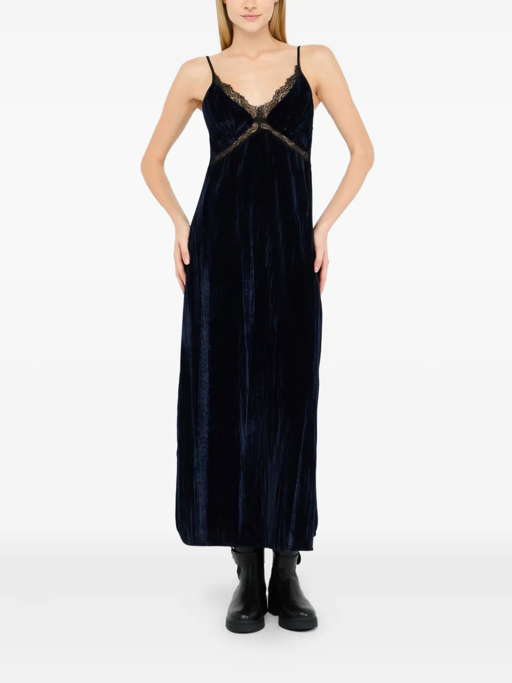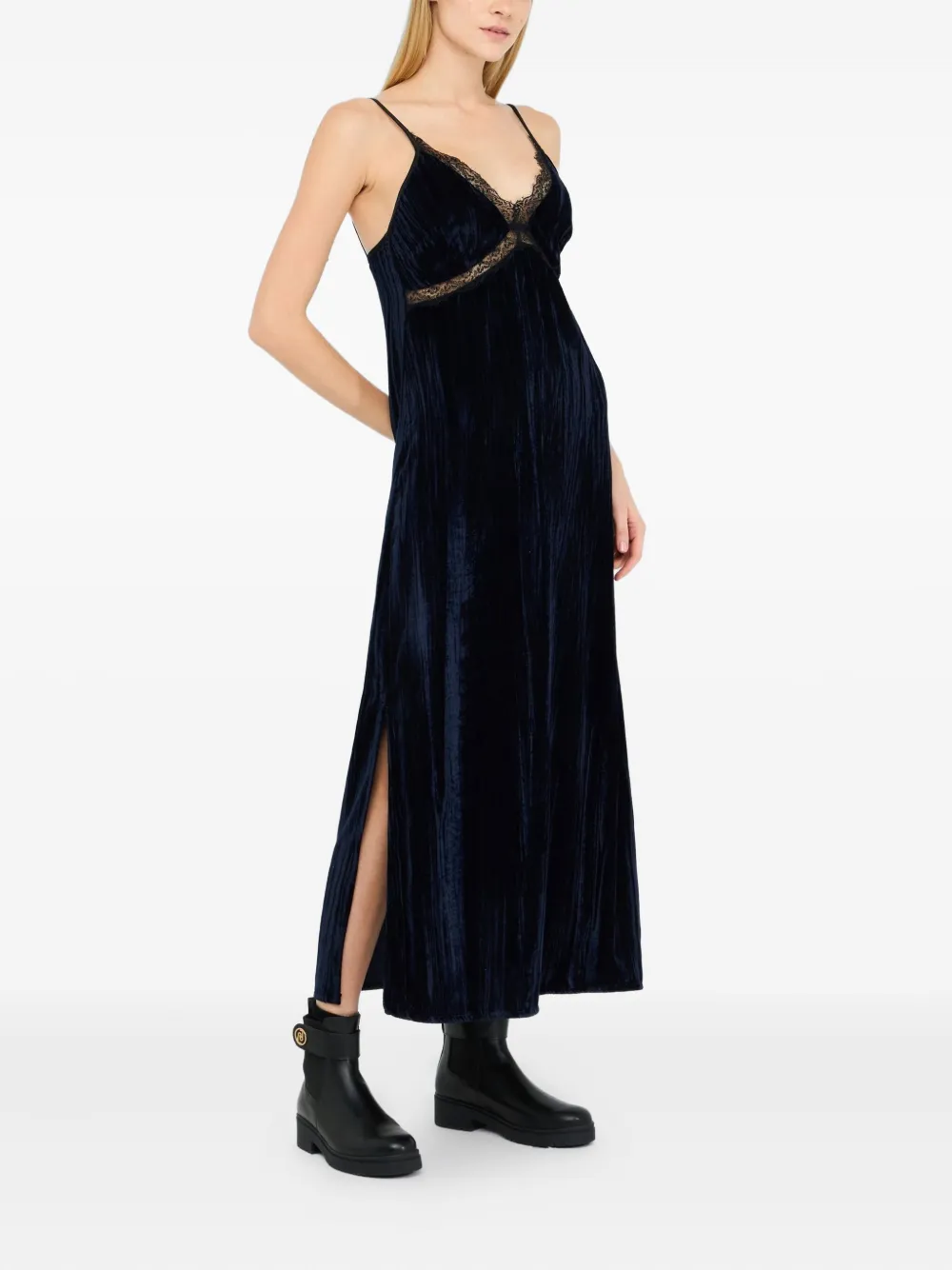 Темно-синяя бархатная фактура, кружевные детали, V-образный вырез, бретели на плечах, разрезы по бокам, застежка на молнию