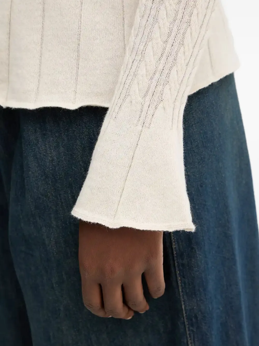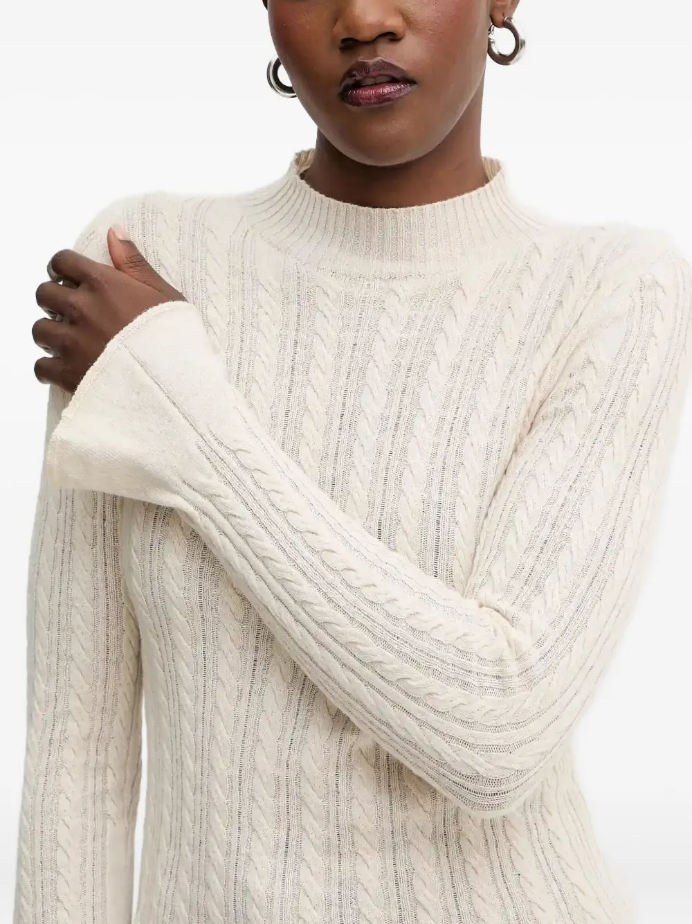 Светло-бежевый вязаный свитер с косами, высоким воротом, длинными рукавами, расклешенными манжетами и ребристой отделкой