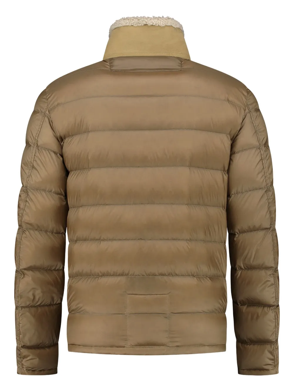 Светло-коричневый цвет, панельный дизайн, утепленные рукава, застежка на молнию, высокий воротник, отделка из овчины