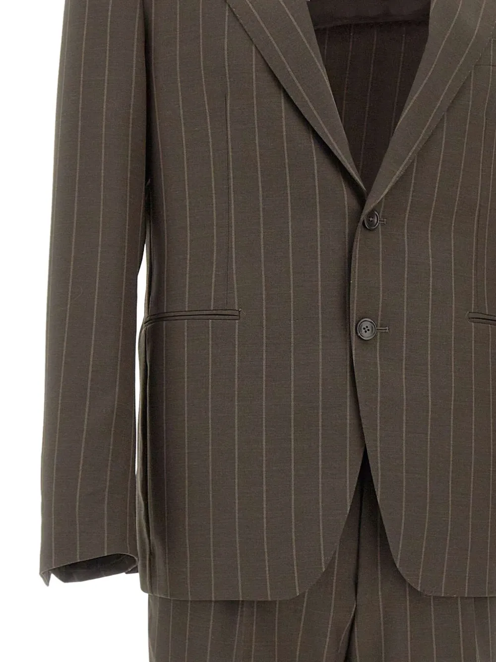 Коричневый в полоску, лацканы с острыми концами, застежка на две пуговицы, манжеты на пуговицах, шлевки для ремня