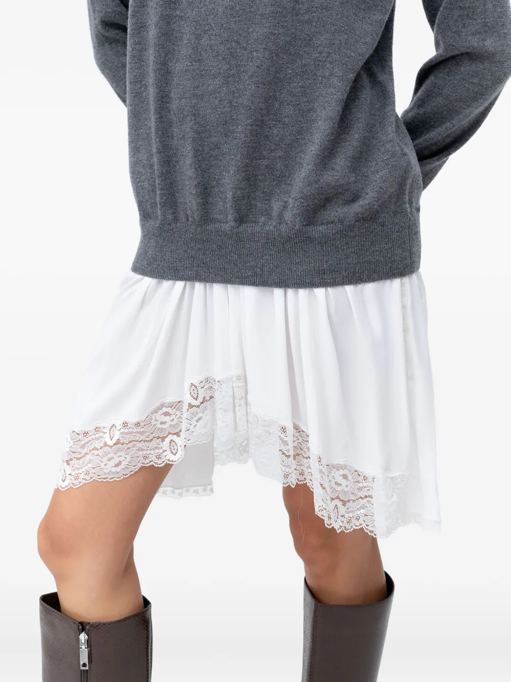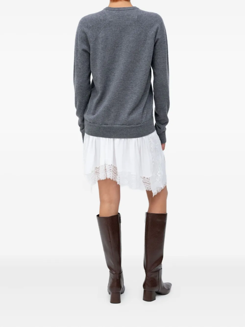 Серый топ с кружевной отделкой, круглым вырезом, длинными рукавами и многослойным дизайном