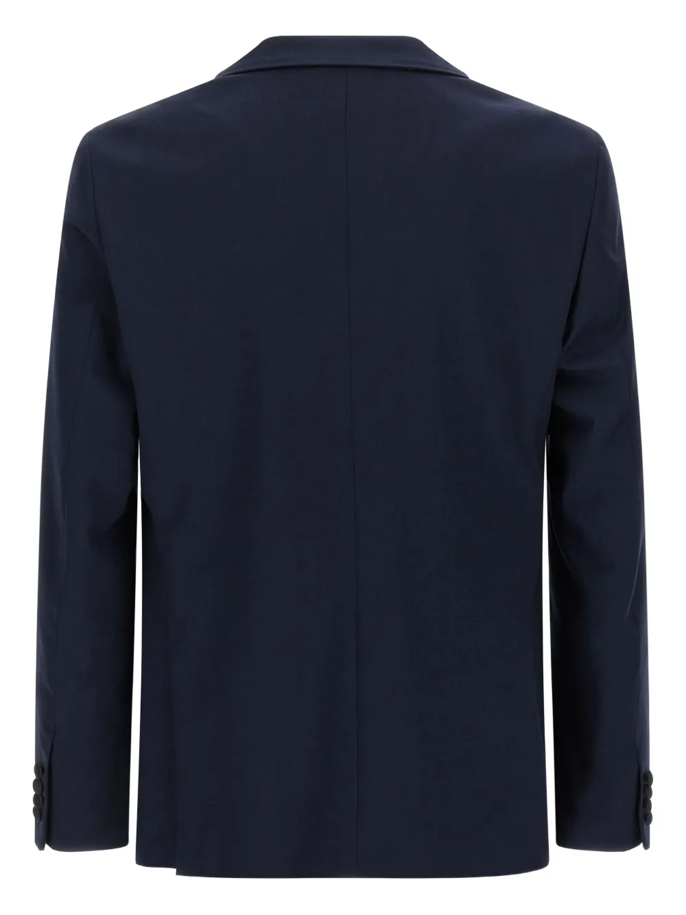 Синие атласные отделки, лацканы с острыми концами, застежка на одну пуговицу, манжеты с петлями для пуговиц, застежка спереди на молнию и пуговицу, передние карманы