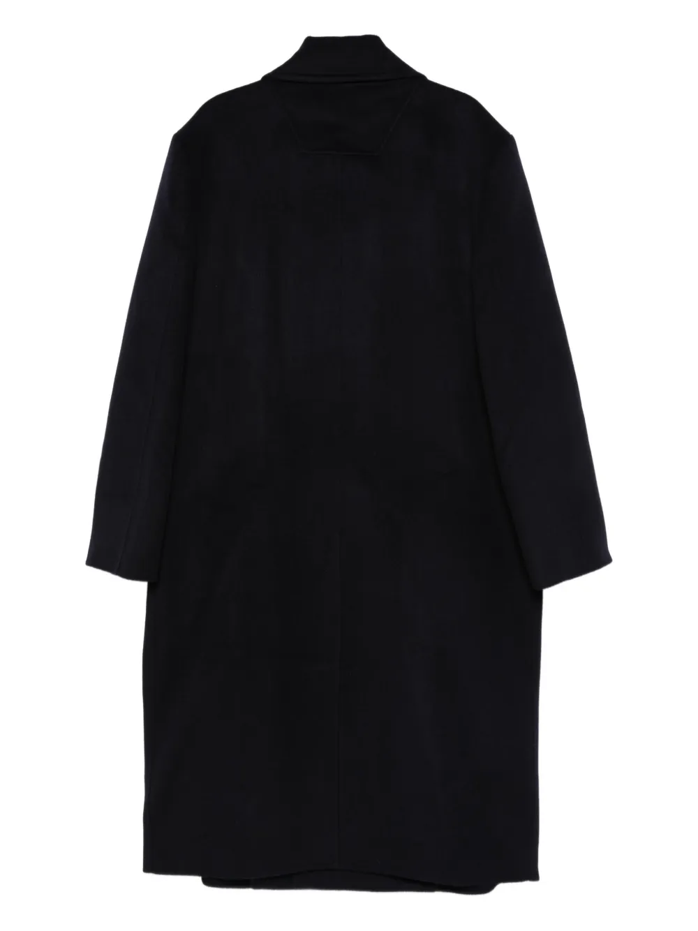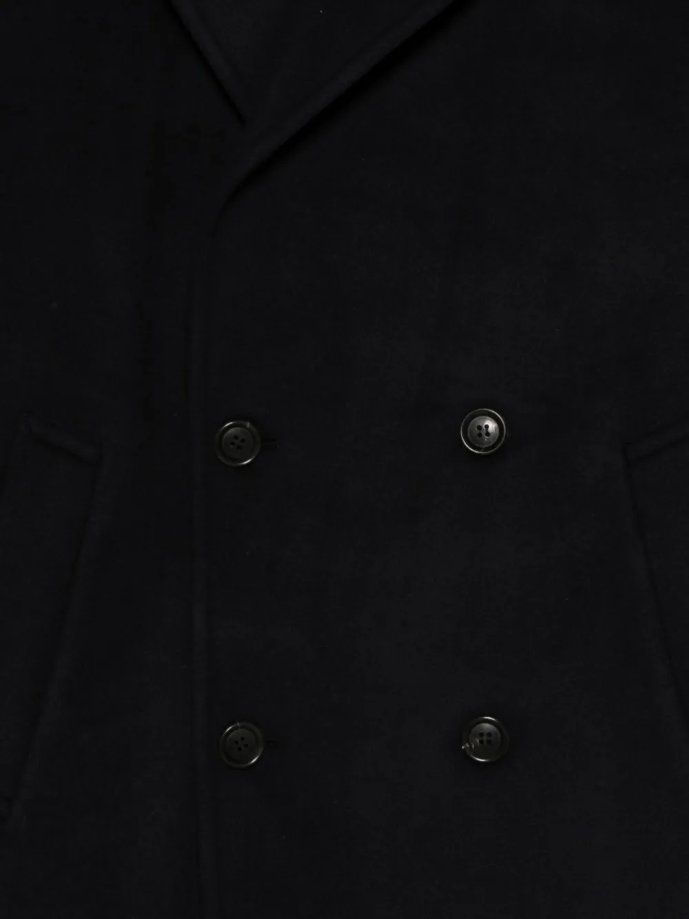 Темно-синий, застежка на две пуговицы, лацканы с вырезом, два передних прорезных кармана