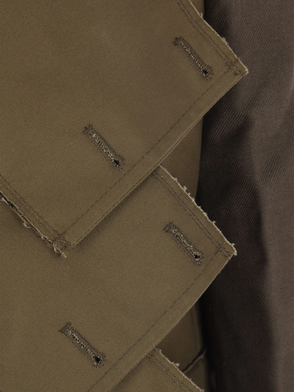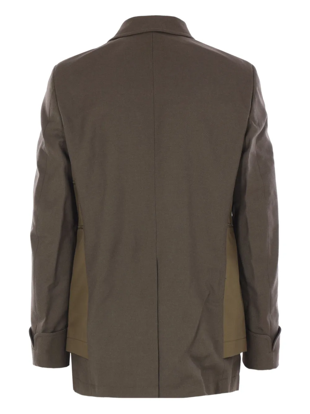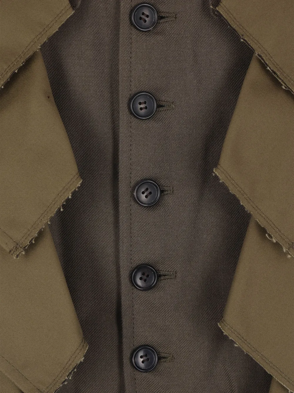 Коричневые и зеленые перекрывающиеся передние панели, заостренный воротник, застежка на пуговицы, несколько карманов, длинные рукава