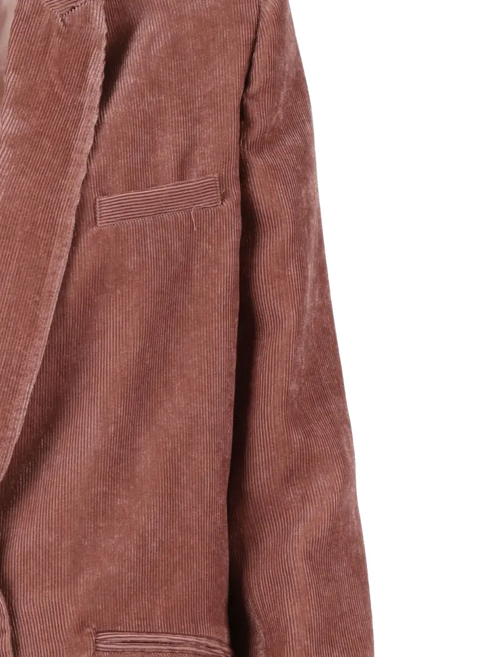 Розовая вельветовая фактура, застегивается на пуговицы, лацканы с вырезом, прорезной карман