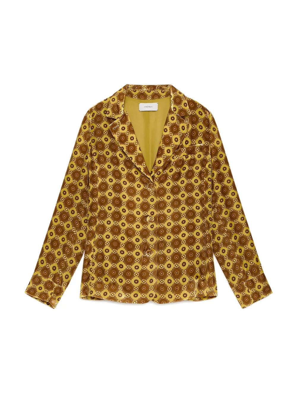 Горчично-желтый цвет, геометрический узор, застежка на пуговицы спереди, воротник-стойка, длинные рукава, манжеты на пуговицах