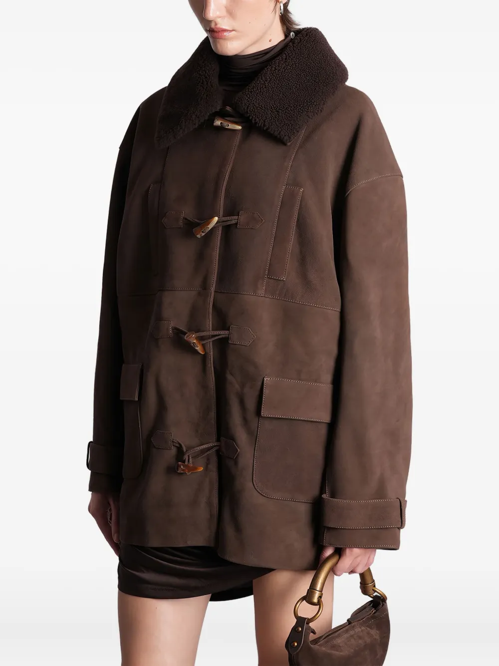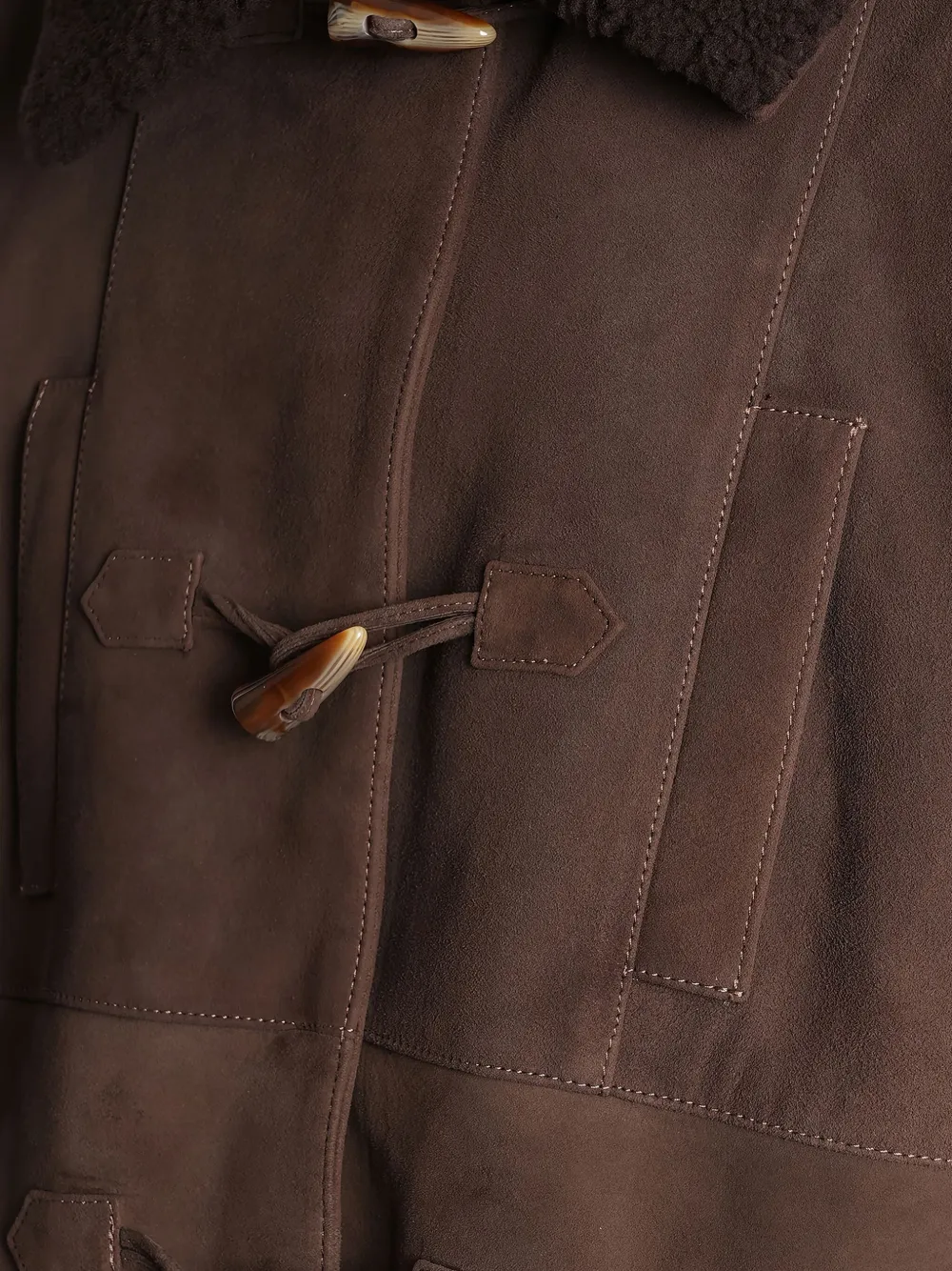 Коричневый цвет, воротник из овчины, застежка на_toggle-, панельный дизайн, передние карманы, манжеты на пуговицах