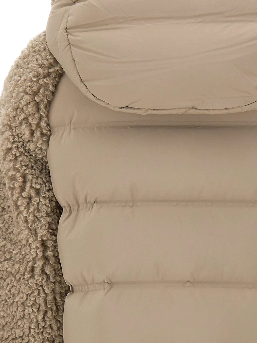 Бежевый утепленный дизайн, искусственный овечий мех, стеганые вставки, воротник-стойка, несъемный капюшон, скрытая застежка спереди, длинные рукава