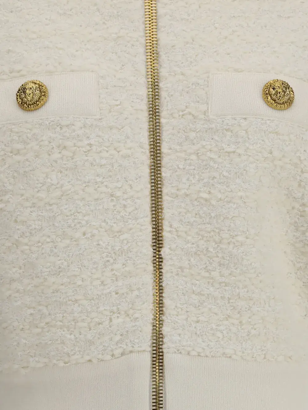 Белый твидовый трикотаж, два кармана, фурнитура под золото, застежка-молния