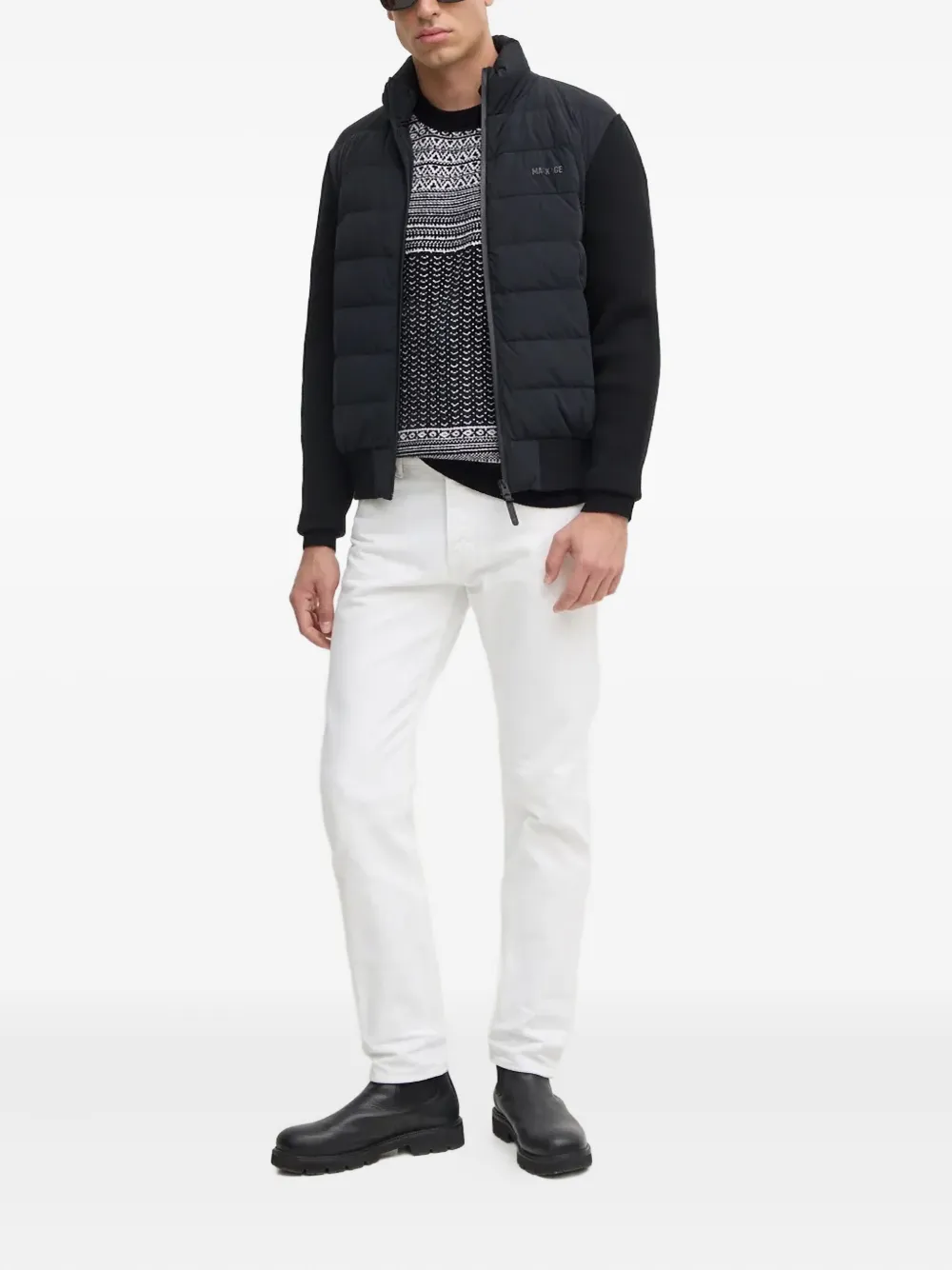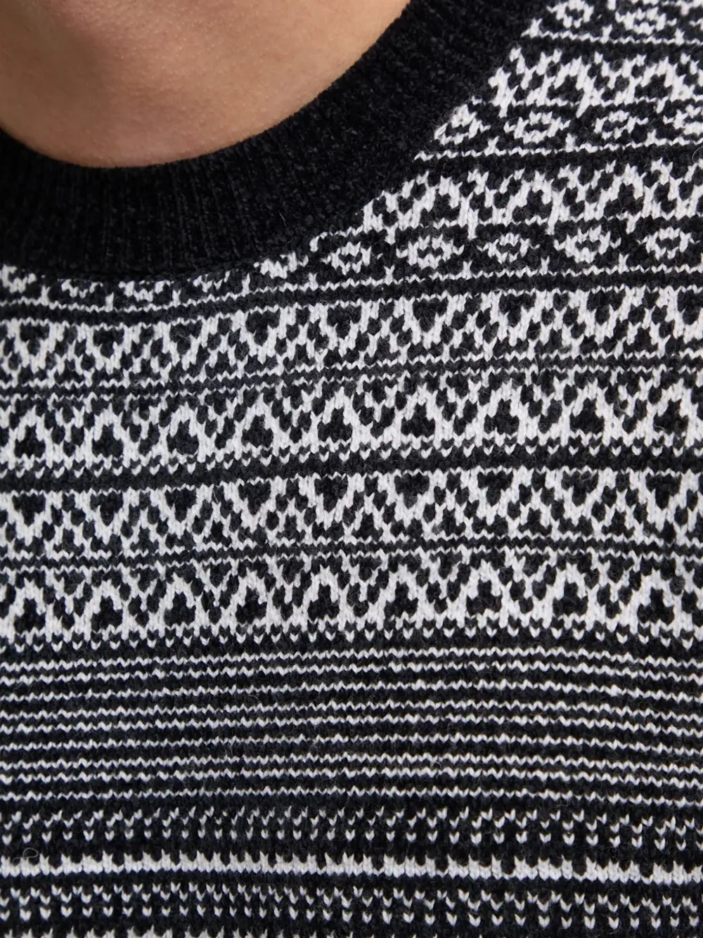 Черно-белый узор, круглый вырез, длинные рукава, ребристые манжеты и подол