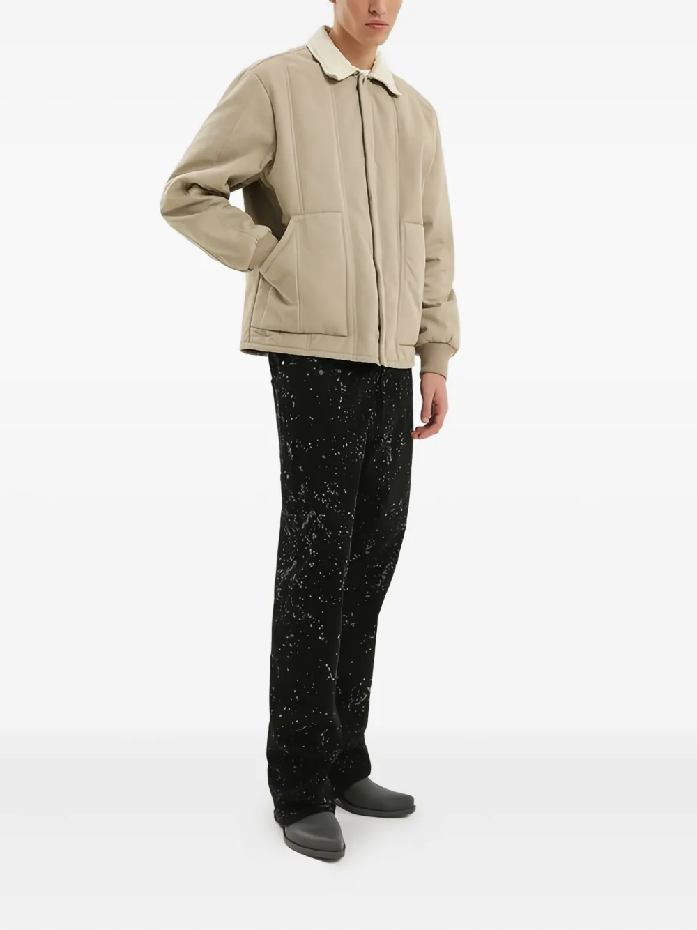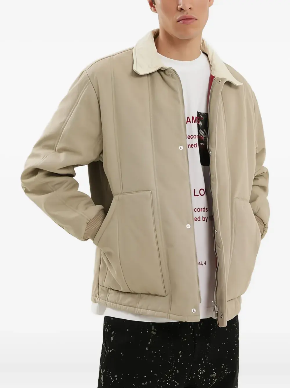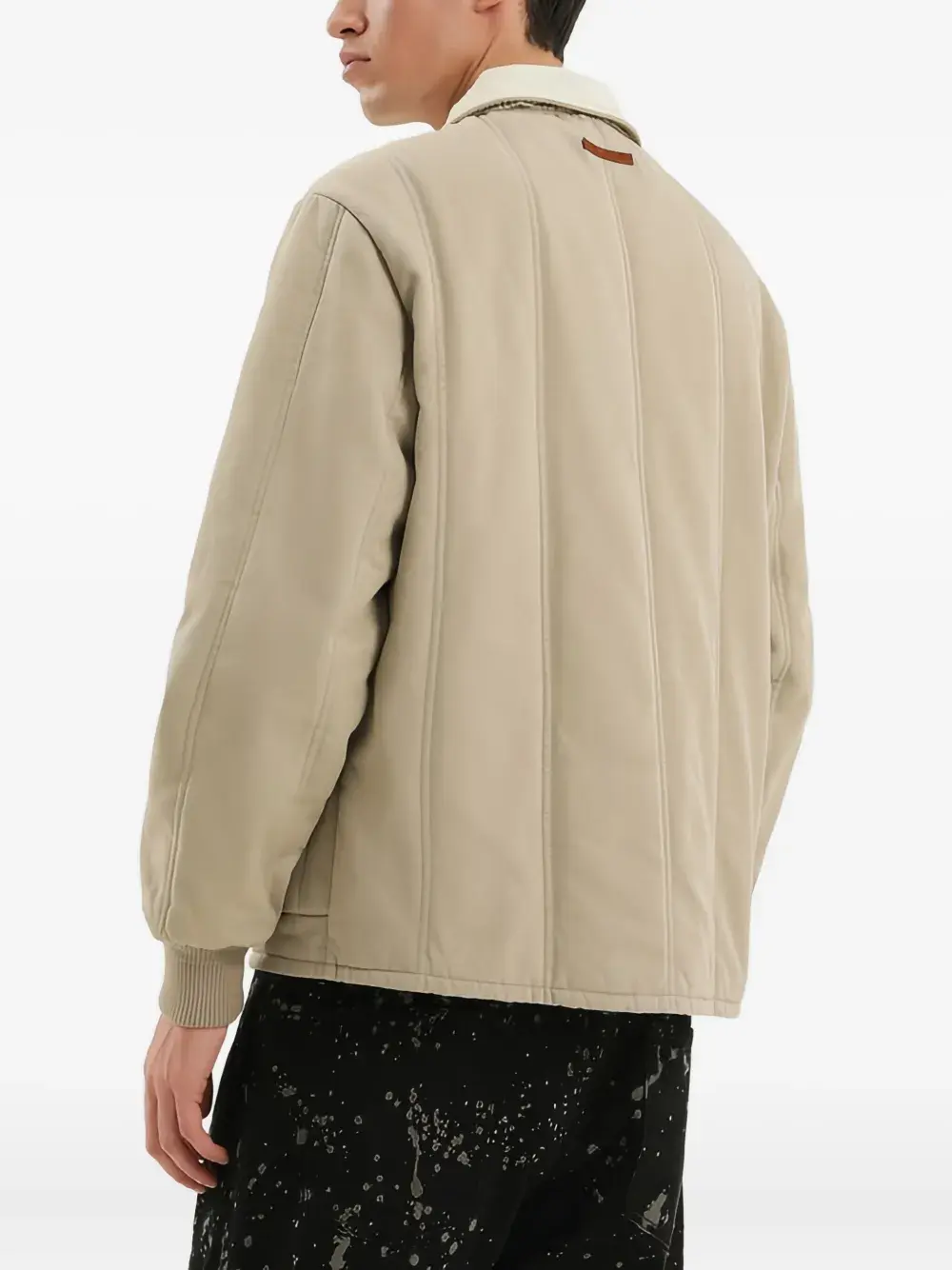 Бежевый стеганый дизайн, воротник-стойка, накладные карманы спереди, ребристые манжеты, застежка-молния