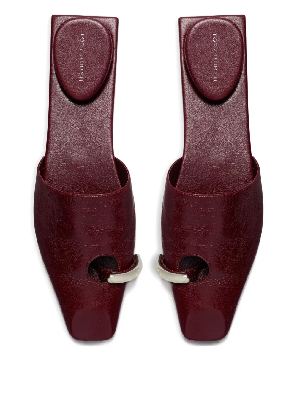 Темно-карминовая кожа, фурнитура серебристого оттенка, детали с проколами, квадратный носок, плоская подошва