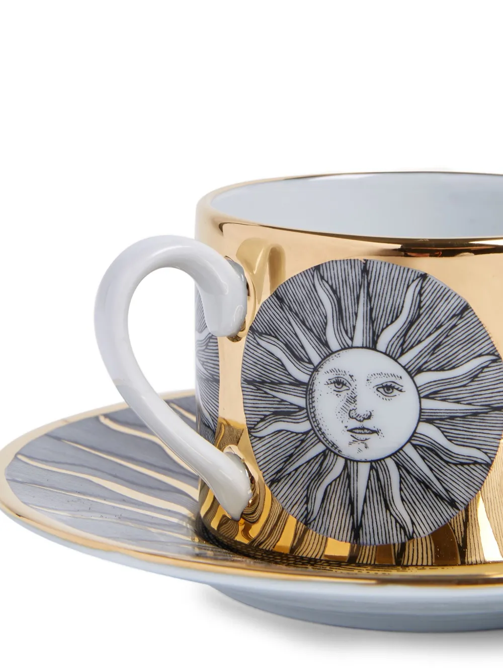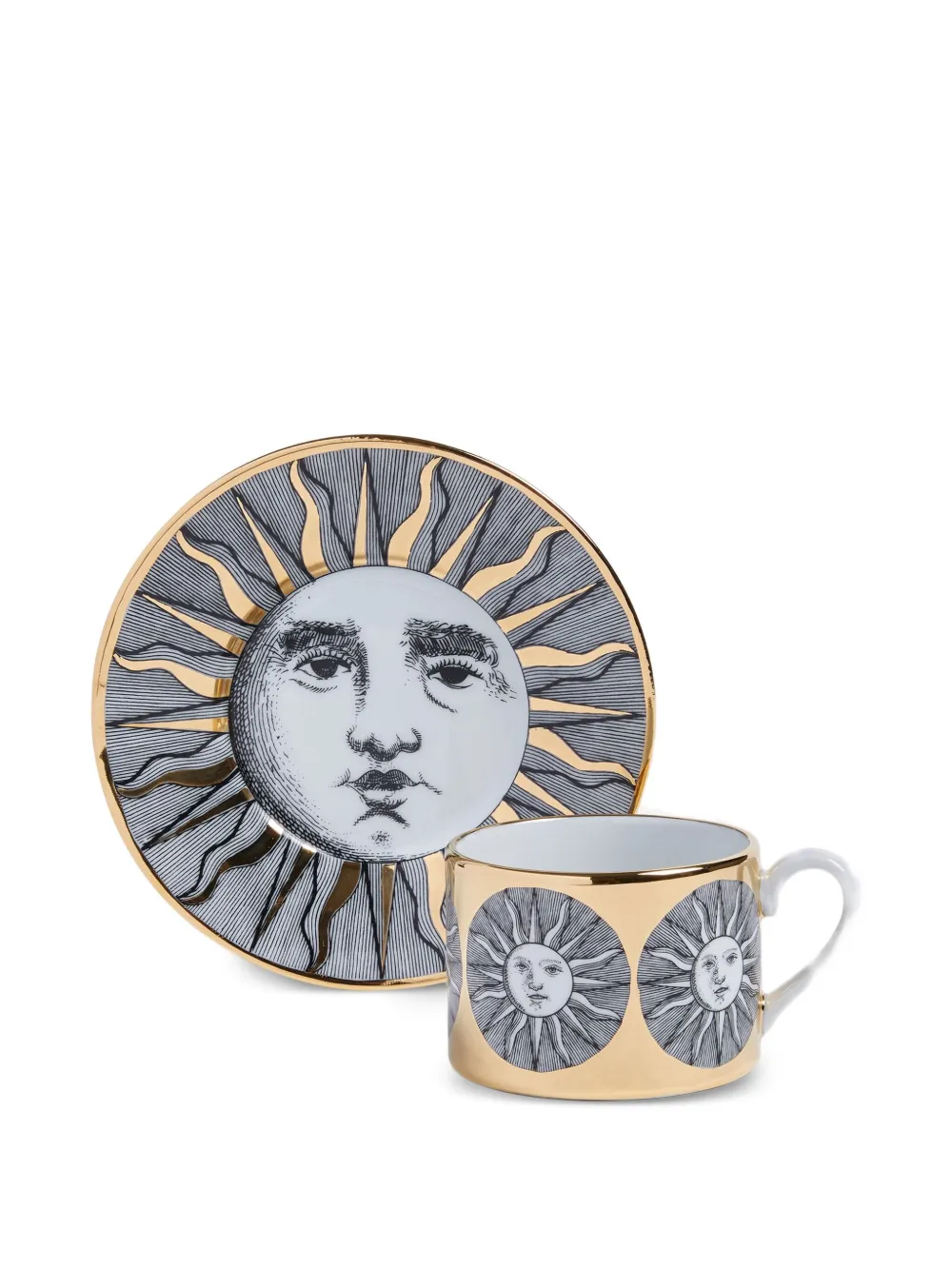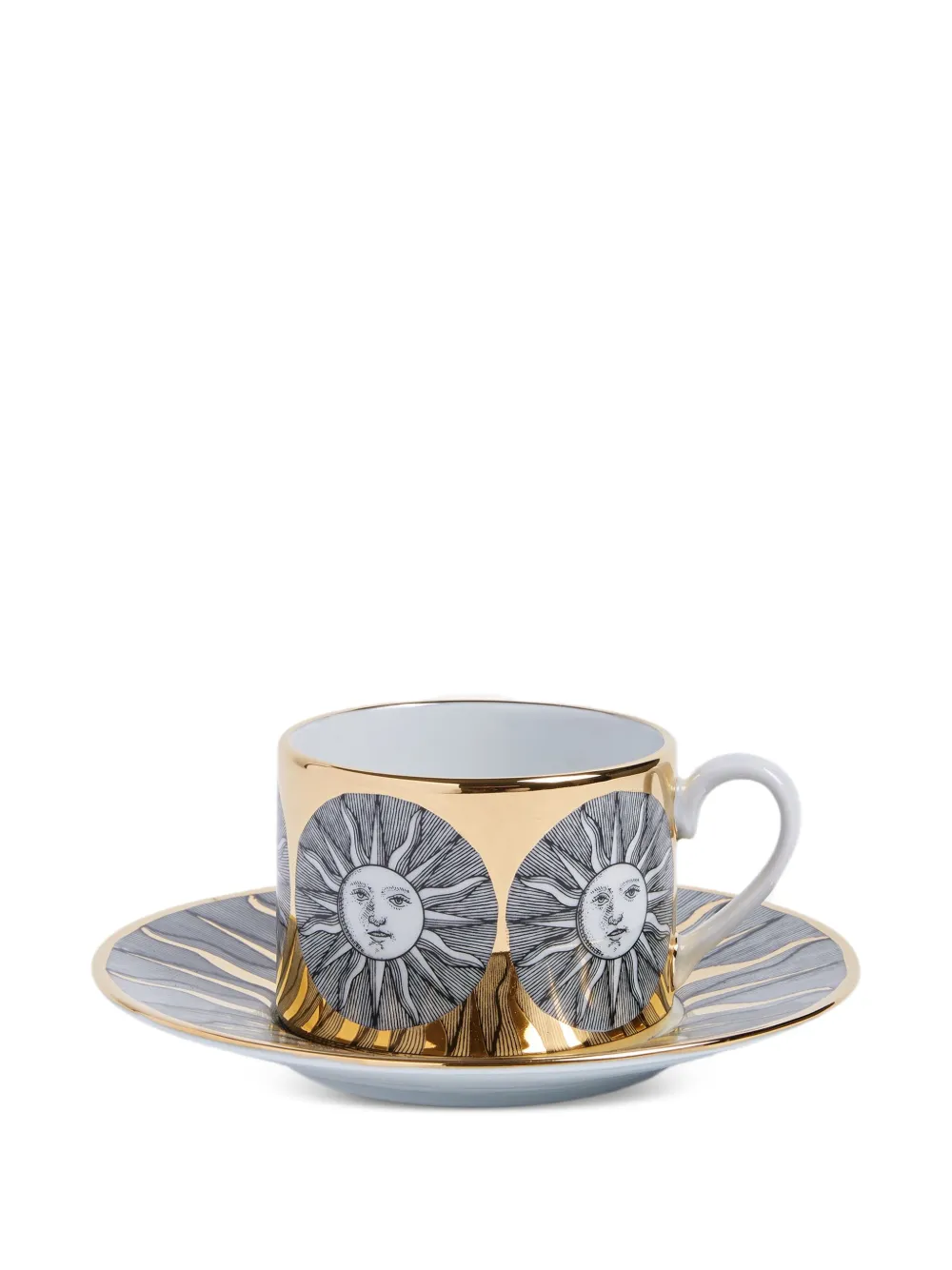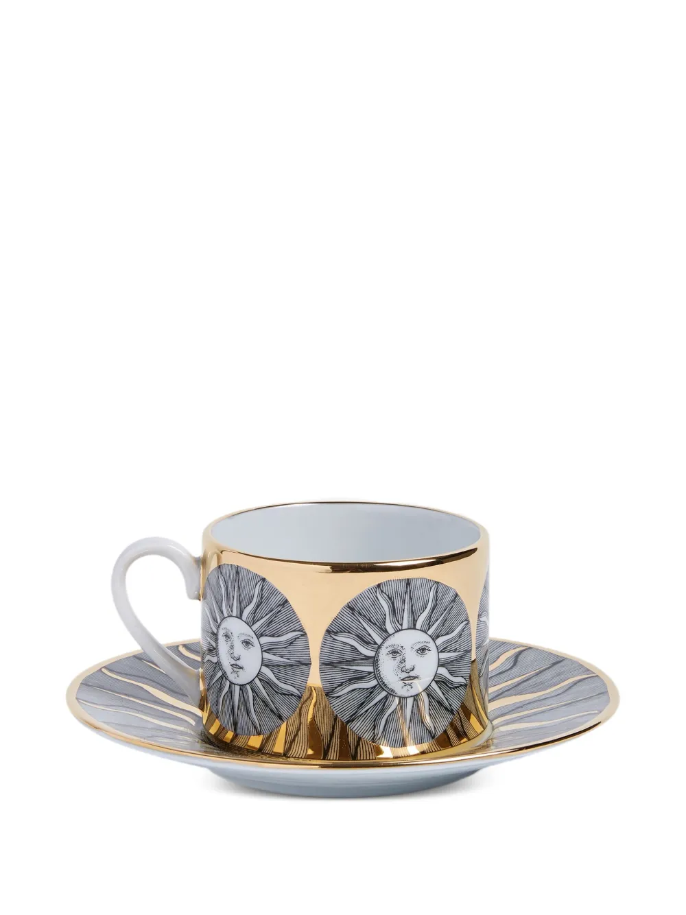 Золотистая керамическая чашка и блюдце с принтом солнца от Fornasetti.