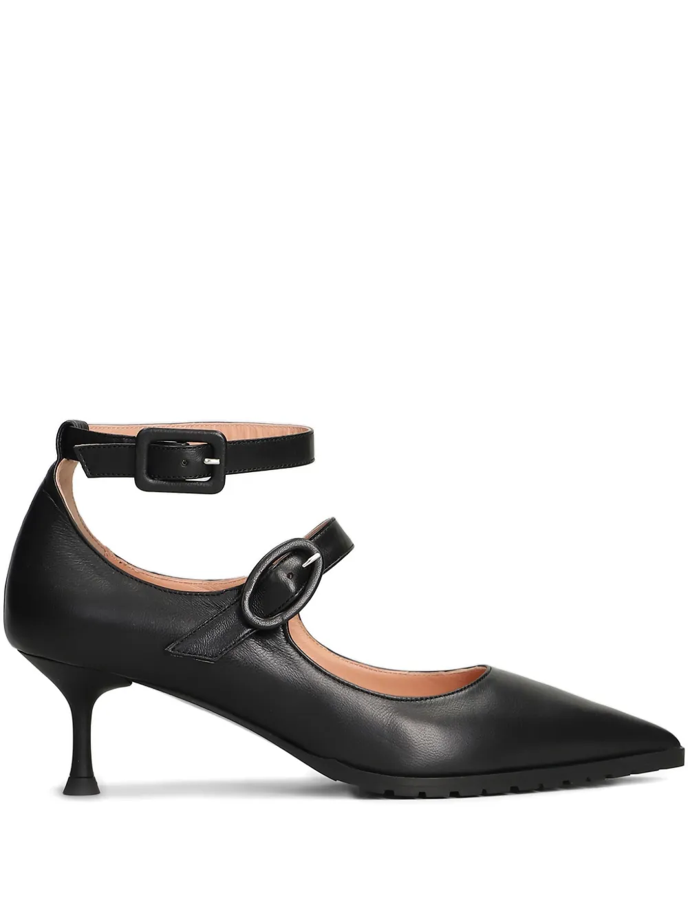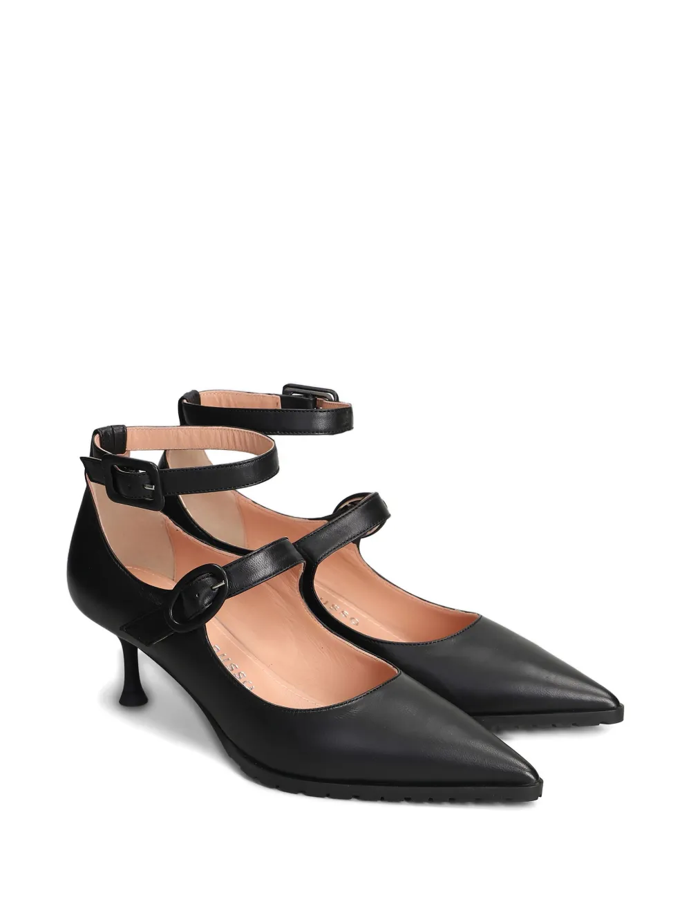 Черные туфли на шпильке с заостренным носком, ремешком на щиколотке и застежкой-пряжкой