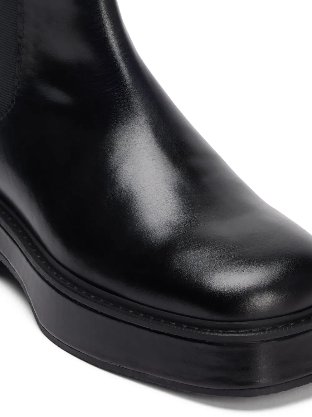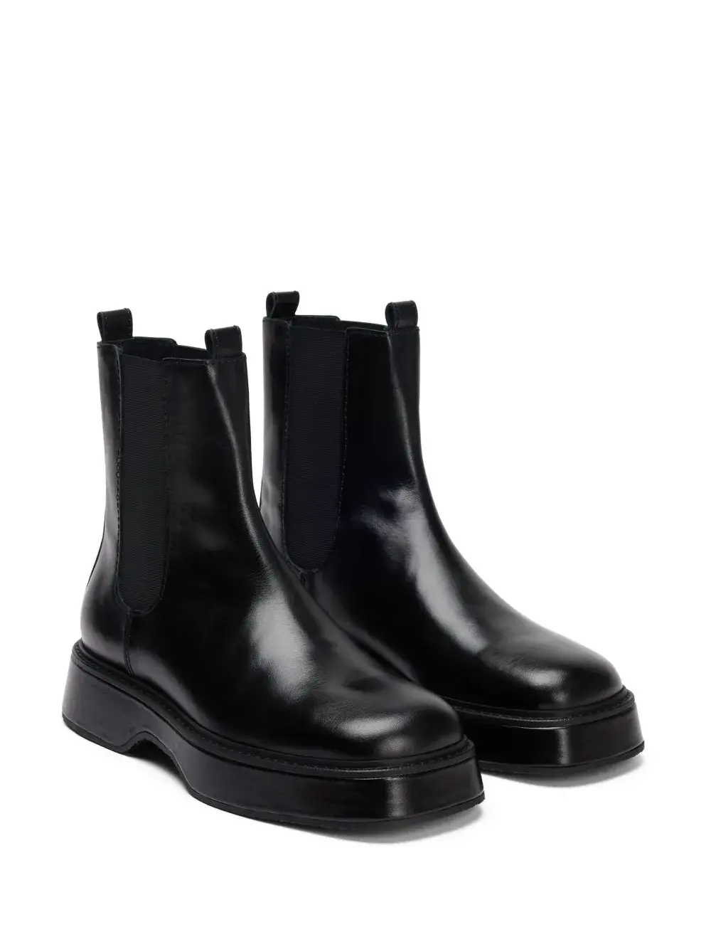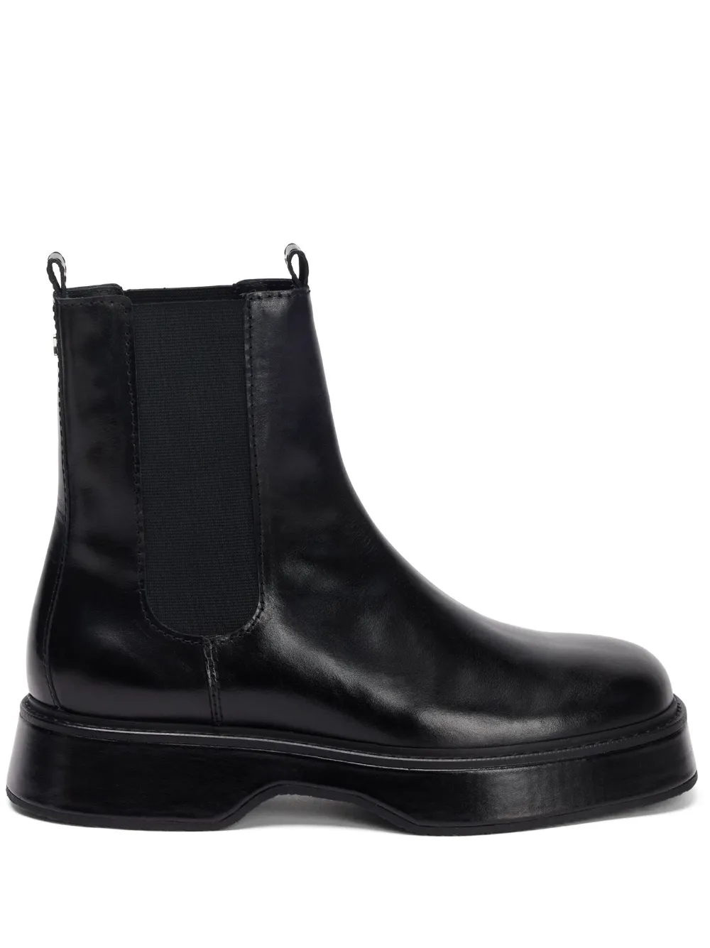 Черный, кожа, эластичные боковые вставки, двойная петля для подтягивания, квадратный носок, высота по щиколотку и плоская резиновая подошва.
