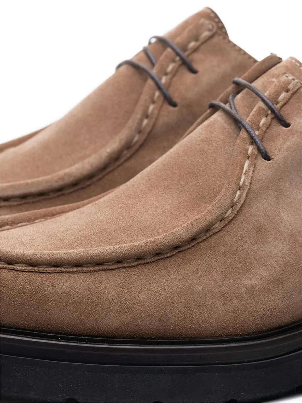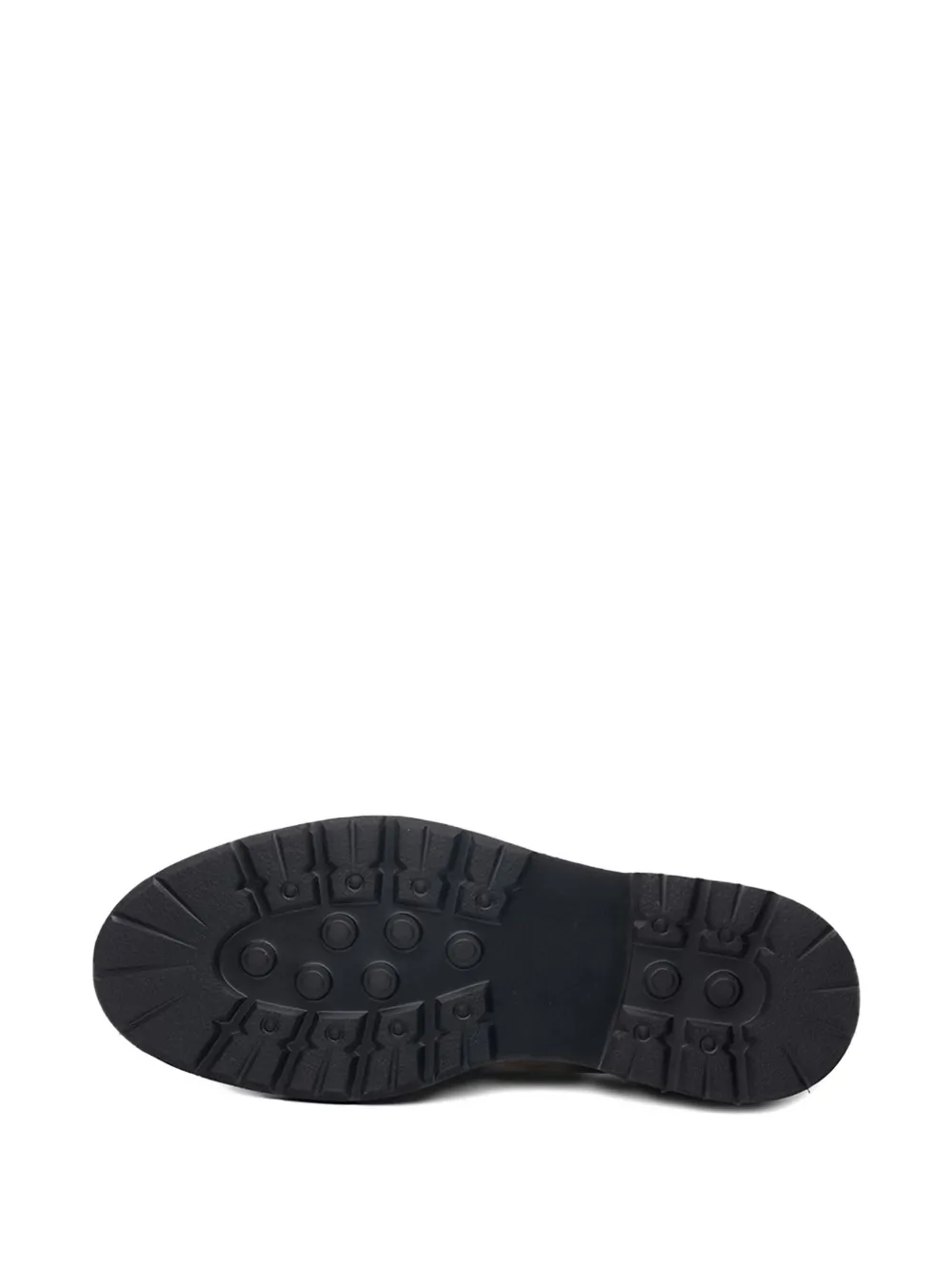 Коричневая отстрочка, шнуровка, круглый носок, плоская подошва, черная подошва
