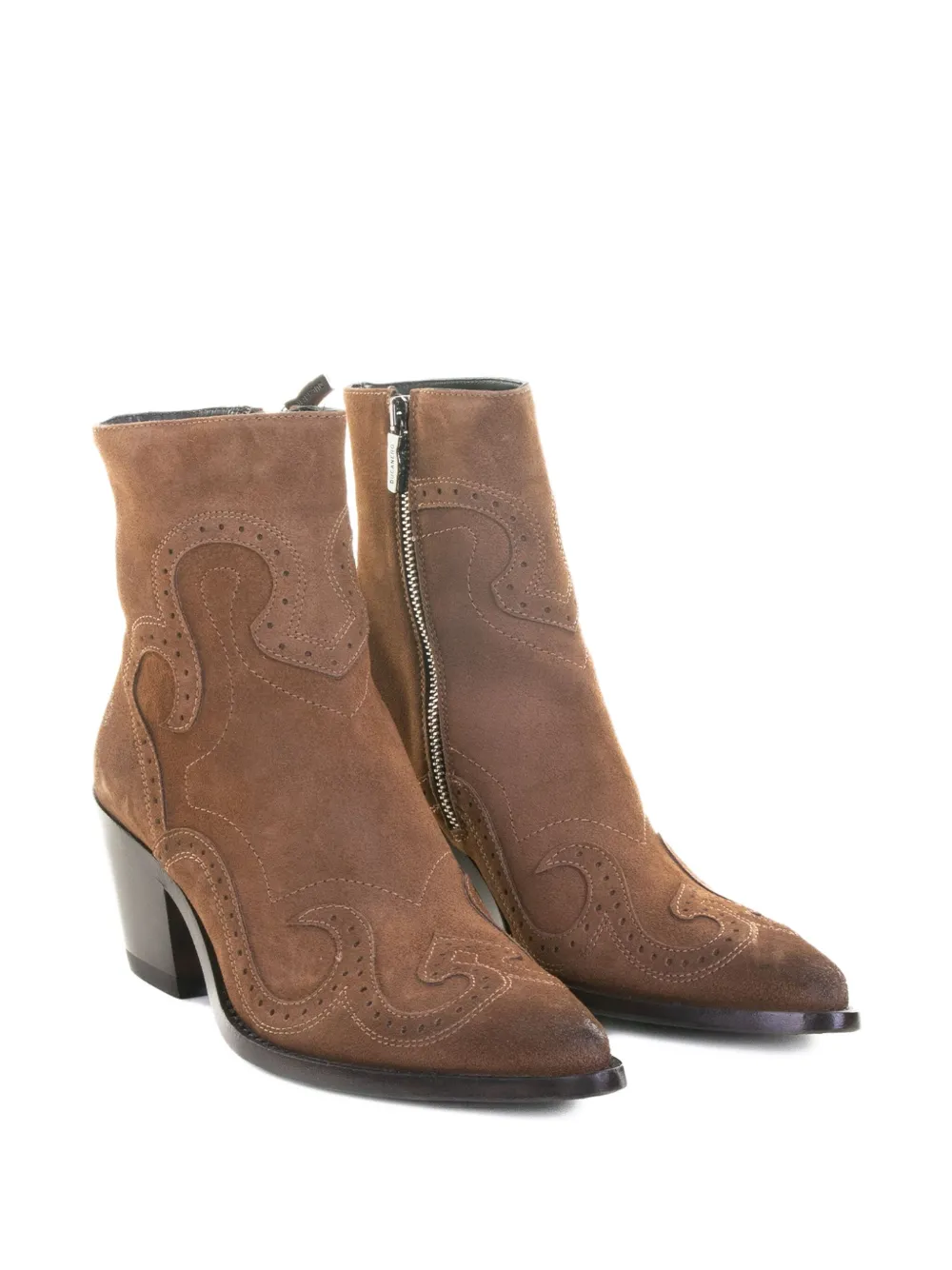 Коричневый цвет, лазерная перфорация, заостренный носок, боковая застежка-молния, каблук-столбик