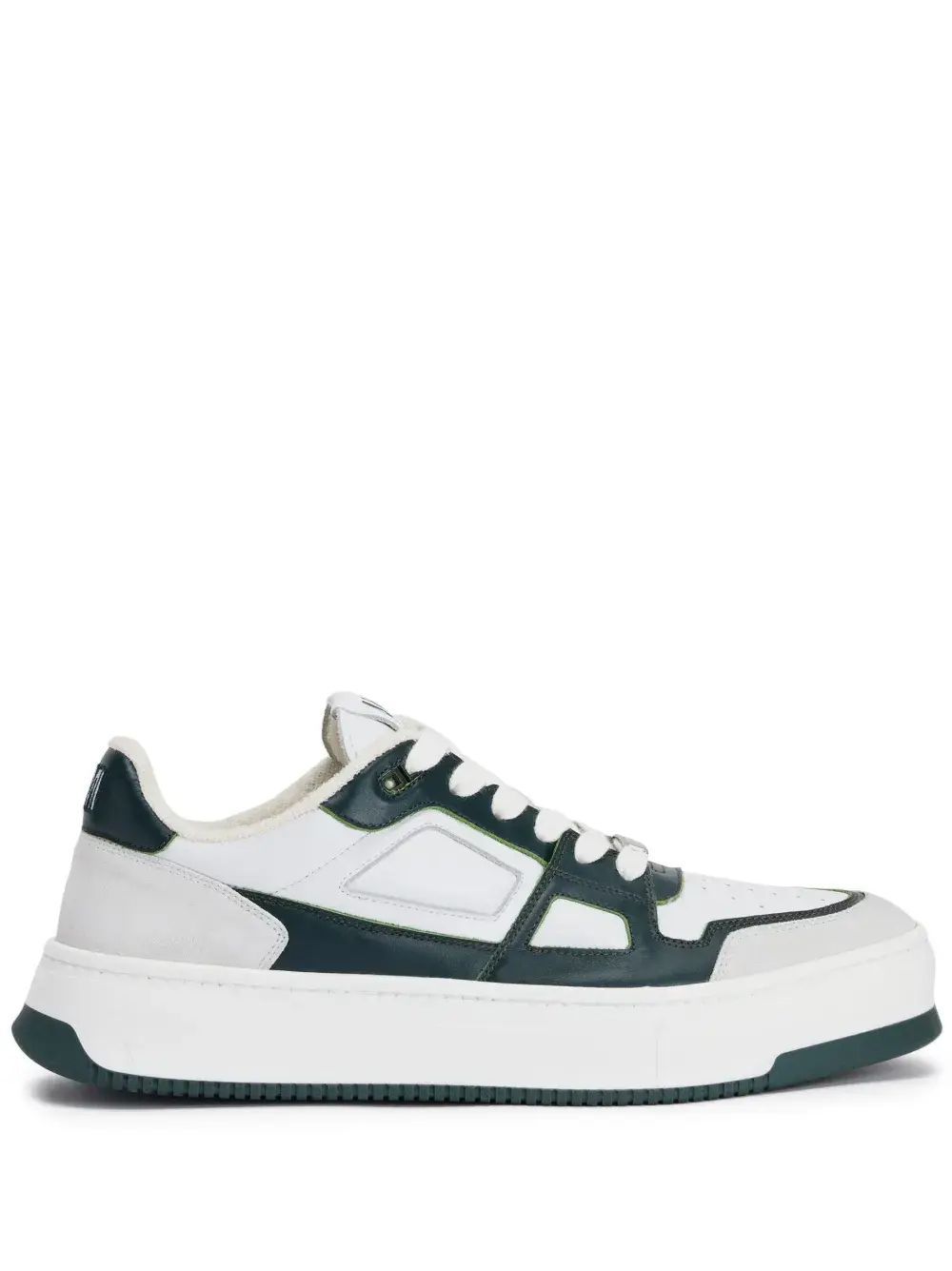 Белый, темно-зеленый, кожа, нашивка с логотипом на язычке, вставки, перфорация, стелька с логотипом, закругленный носок, шнуровка спереди и плоская резиновая подошва.