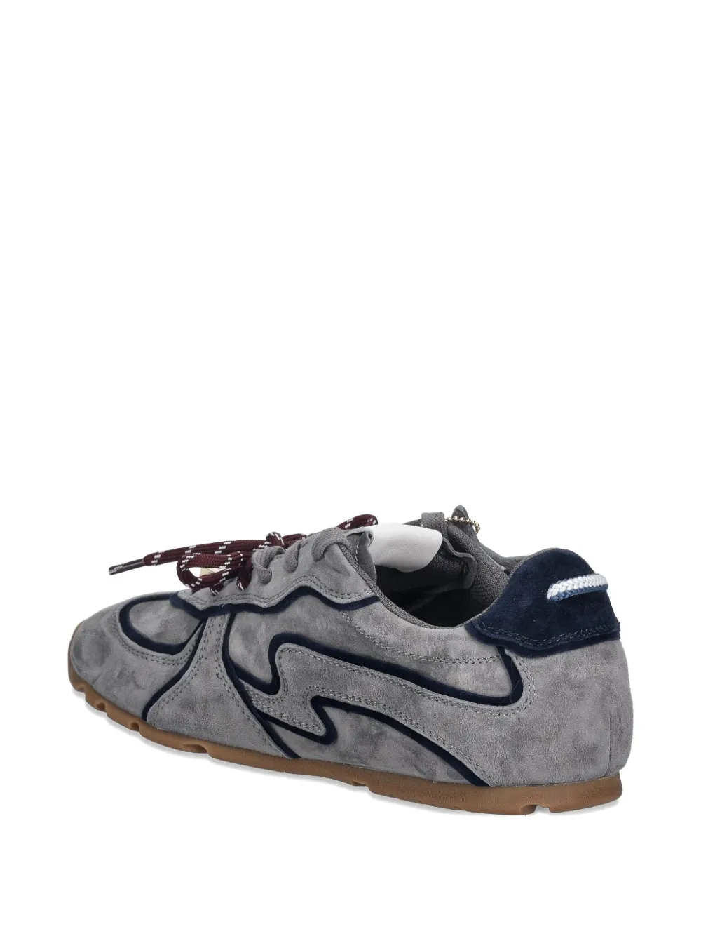 Серый цвет, нашивка-декор, шнуровка, контрастная окантовка, задняя петля, резиновая подошва