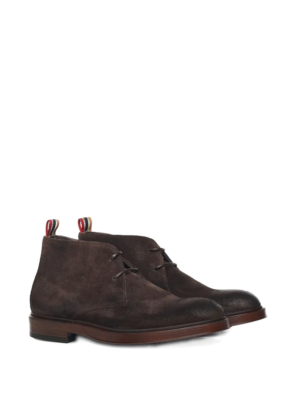 Темно-коричневый замшевый материал, шнуровка, резиновая подошва, полосатая петля для подтягивания