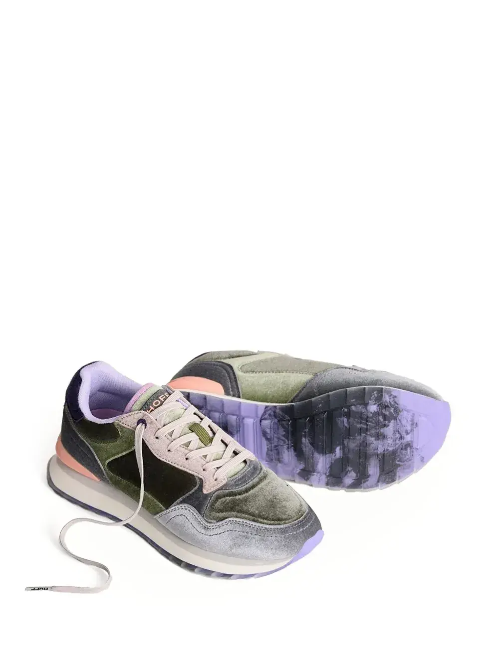 Зеленый и разноцветный дизайн с панелями, шнуровка, логотип на шнурках, петля для подтягивания сзади