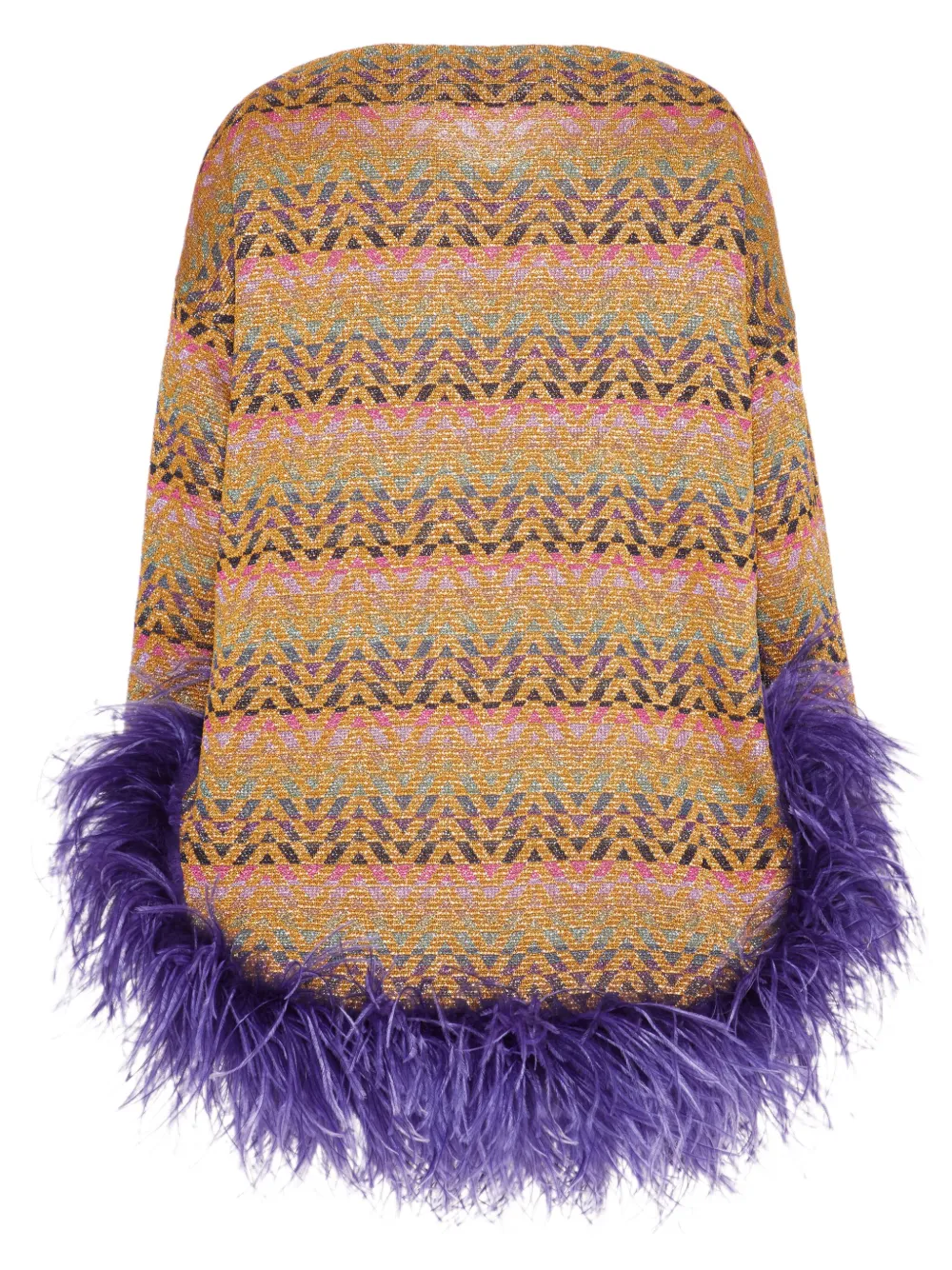 Разноцветный жаккардовый материал с узором люрекс отделка перьями вырез-лодочка приспущенные плечи длинные рукава