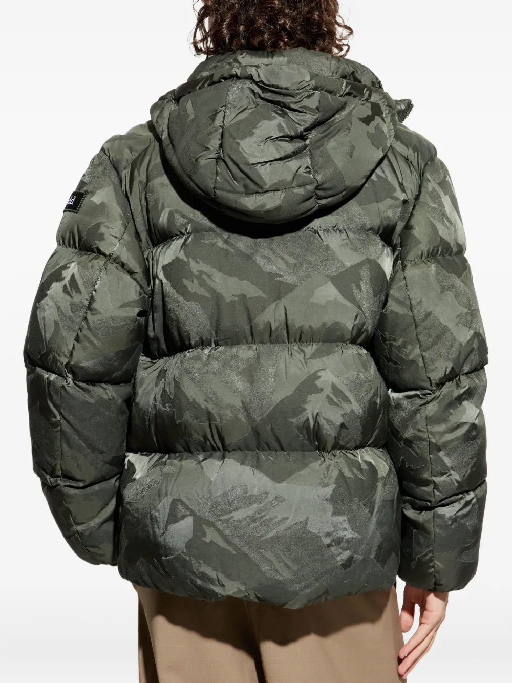 Зеленая куртка с камуфляжным принтом, застежкой-молнией, капюшоном, карманами на молнии и стеганым дизайном