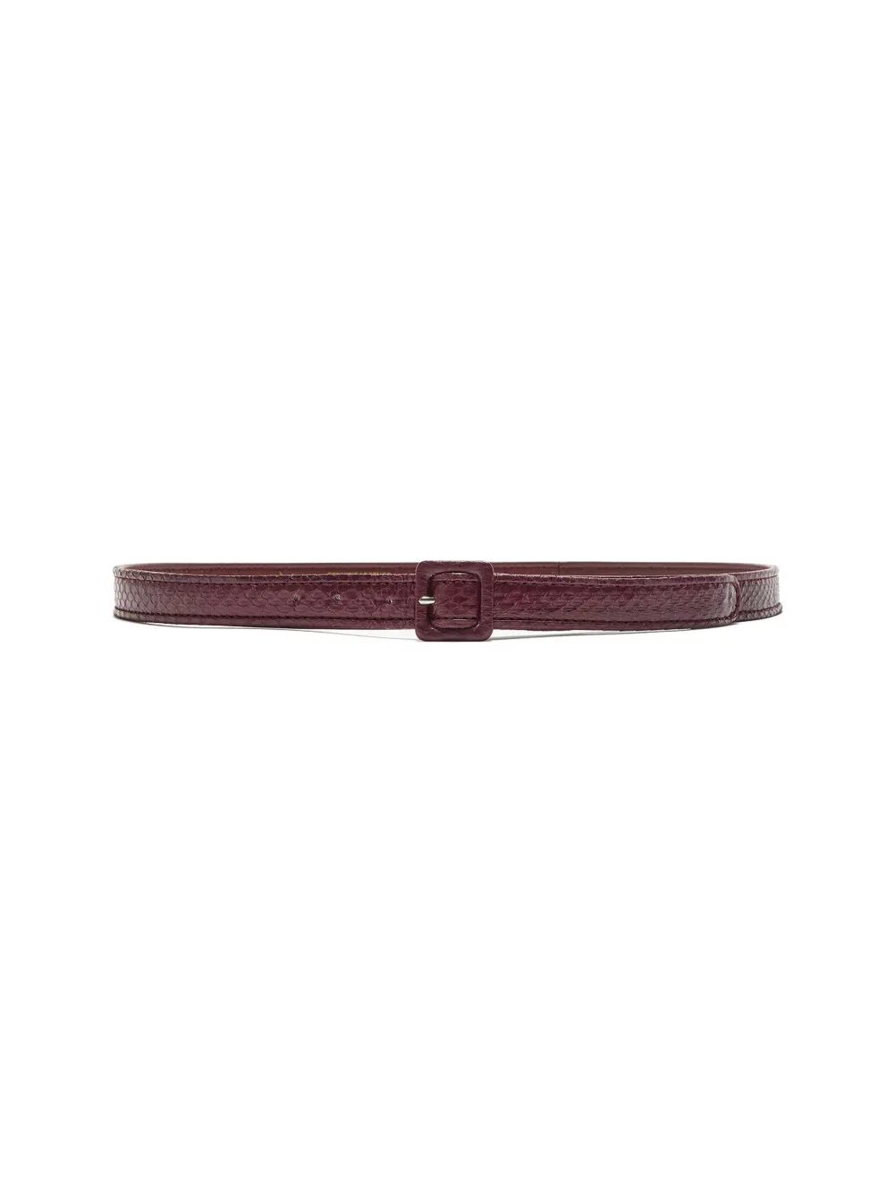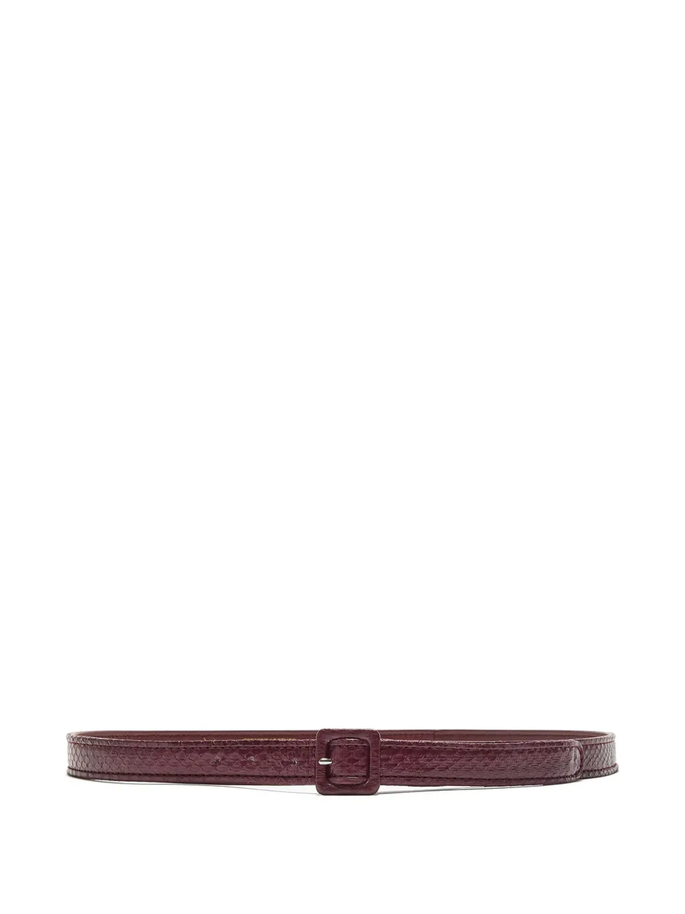 Темно-красный ремень с текстурированной отделкой, квадратной пряжкой, регулируемой посадкой, одним фиксирующим держателем и застежкой на штифт.