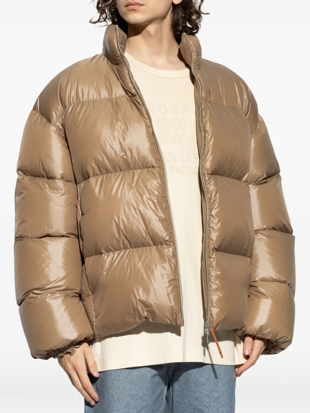 Светло-коричневый пуховик с застежкой-молнией, высоким воротником и кулиской по низу.