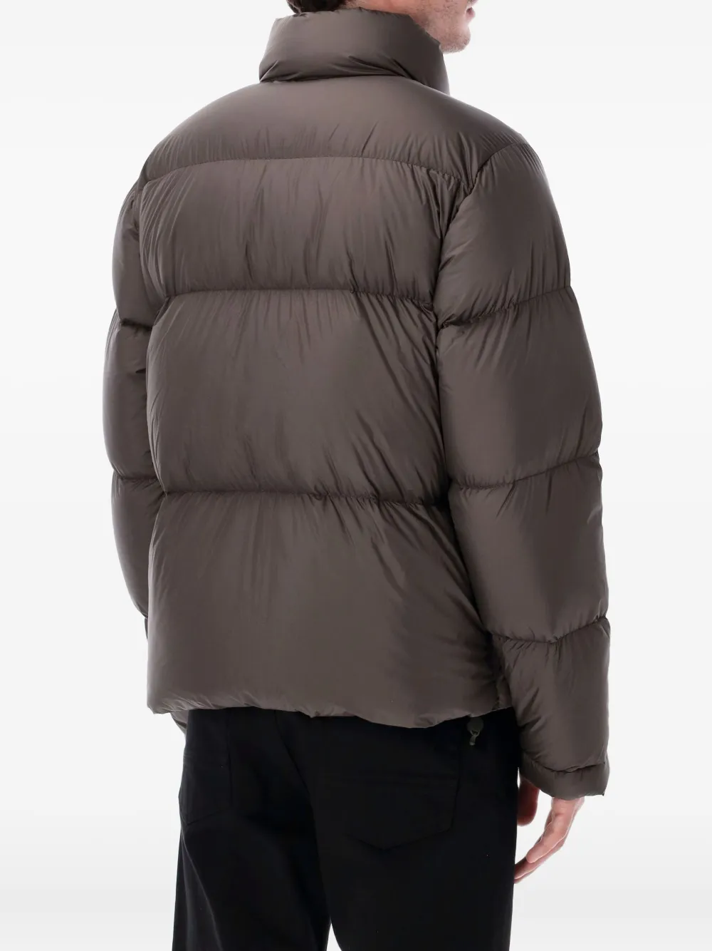 Оливковый цвет, стеганый дизайн, высокий воротник, передние карманы, застежка на молнии
