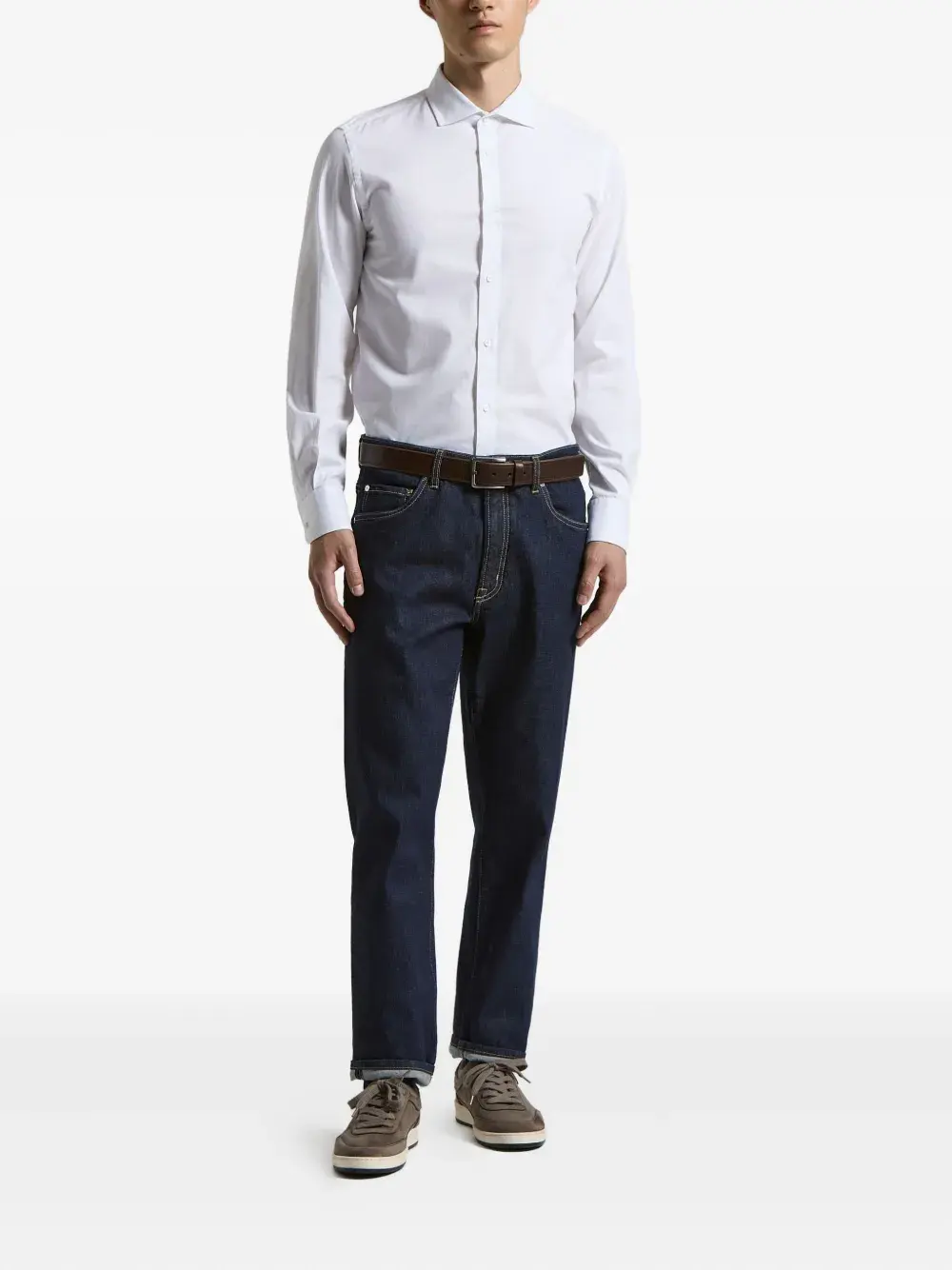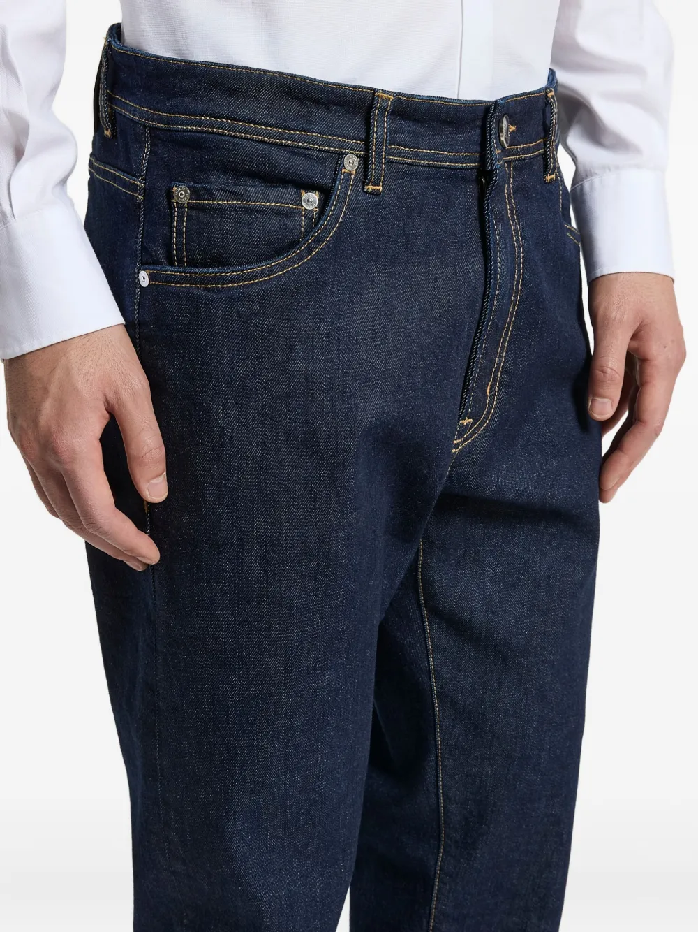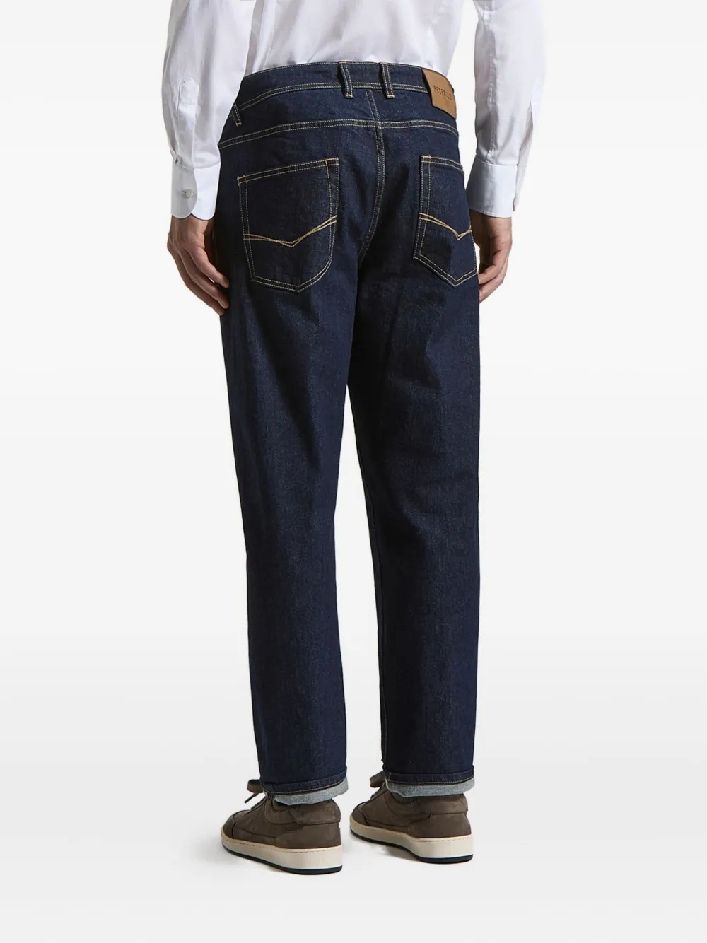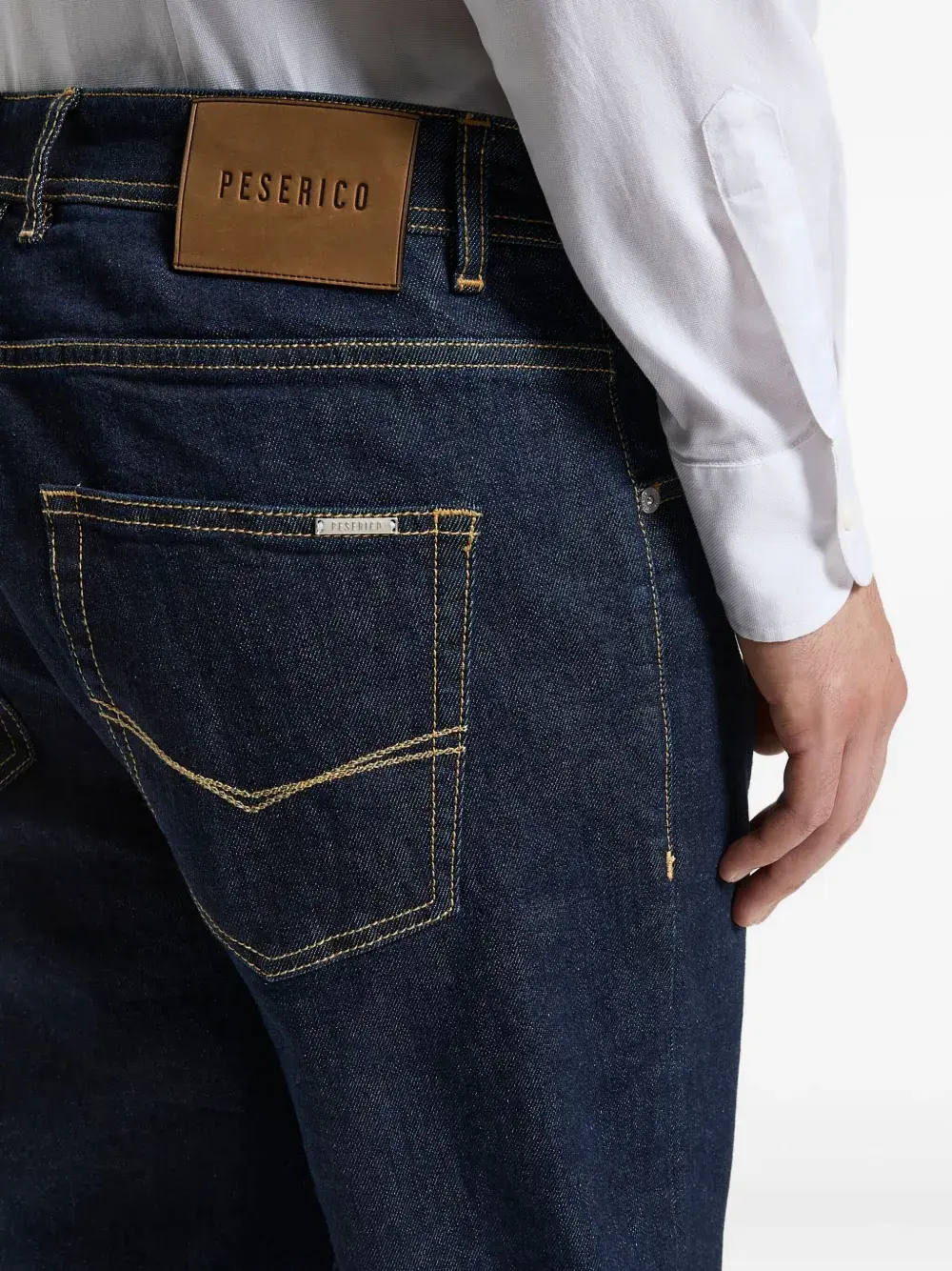 Синий цвет, застежка на пуговицы, шлевки для ремня, пять карманов, нашивка с логотипом сзади, контрастная строчка