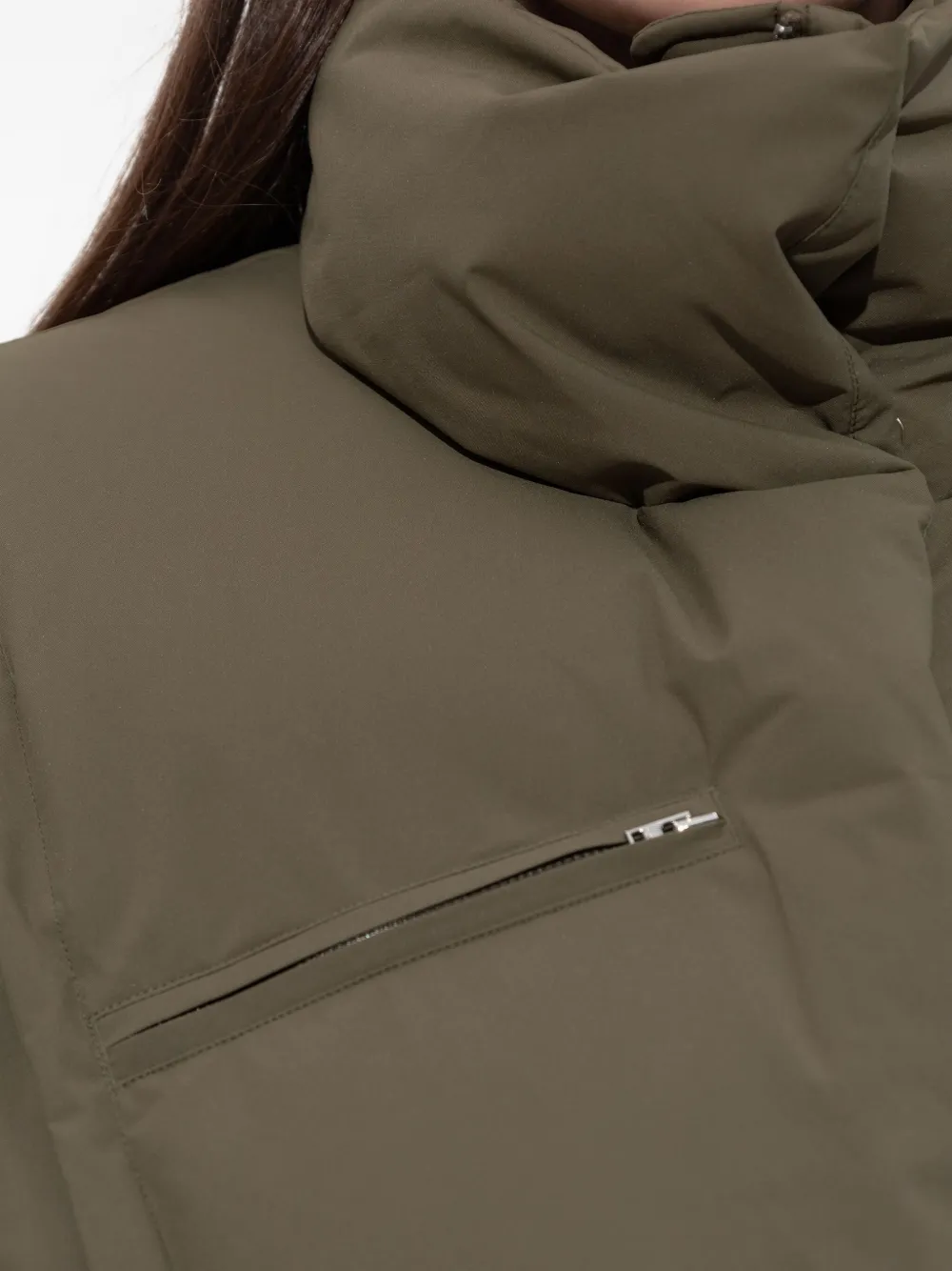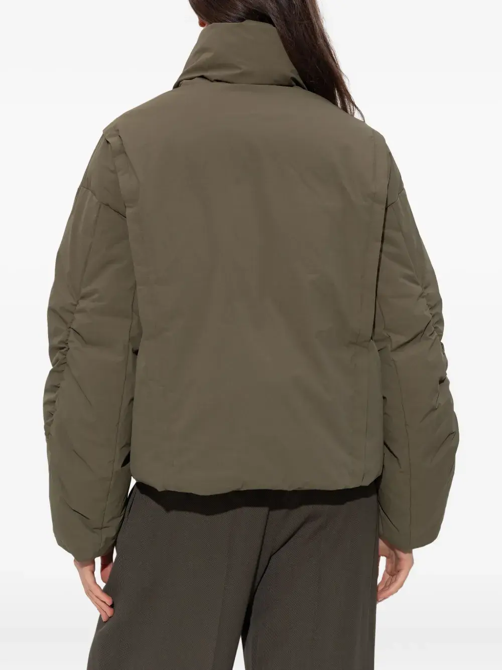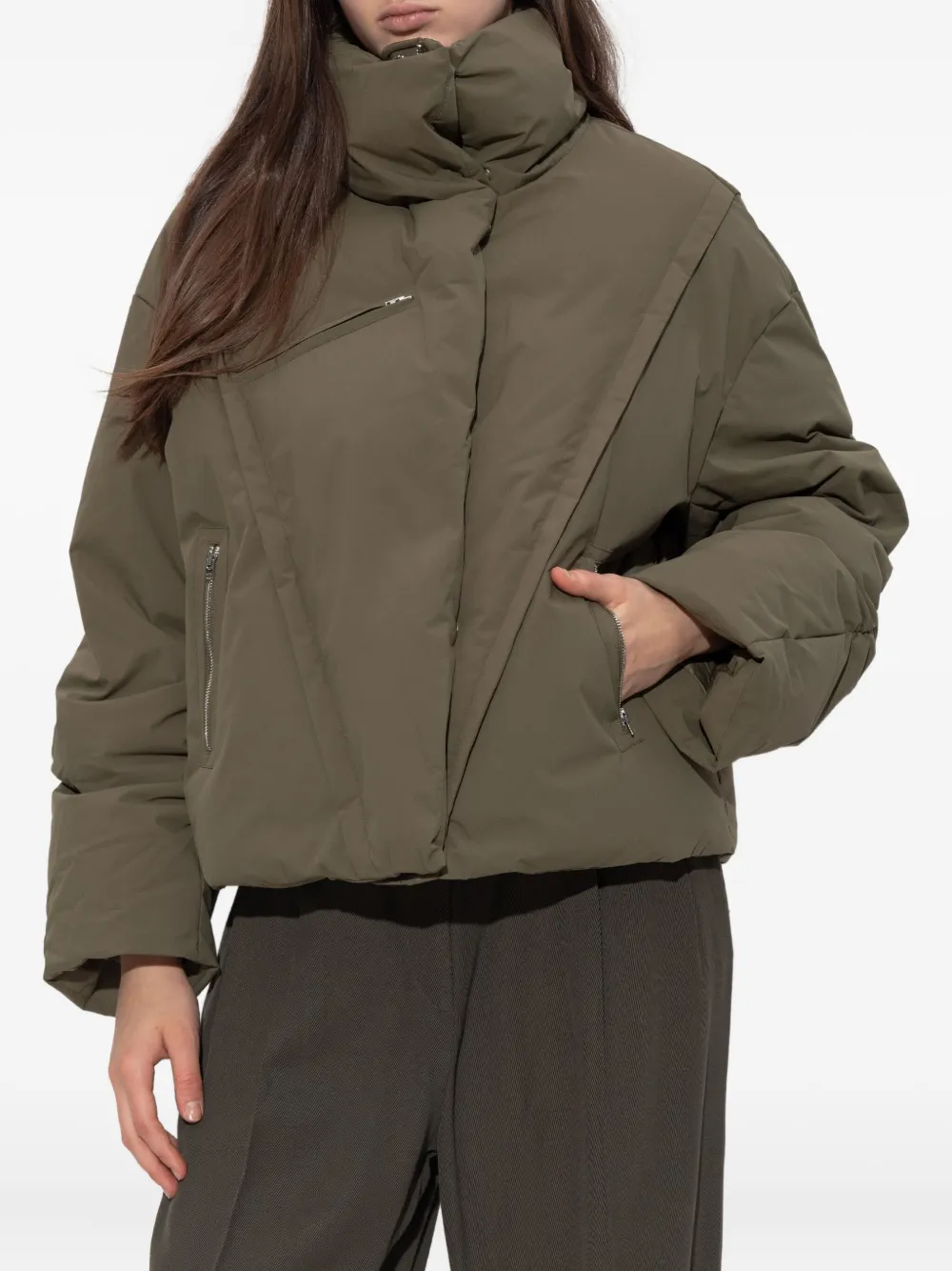 Зеленый цвет, высокий воротник с молнией, присборенные рукава, застежка-молния спереди, боковые карманы на молнии