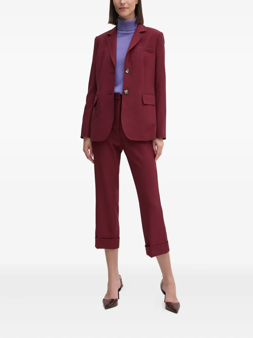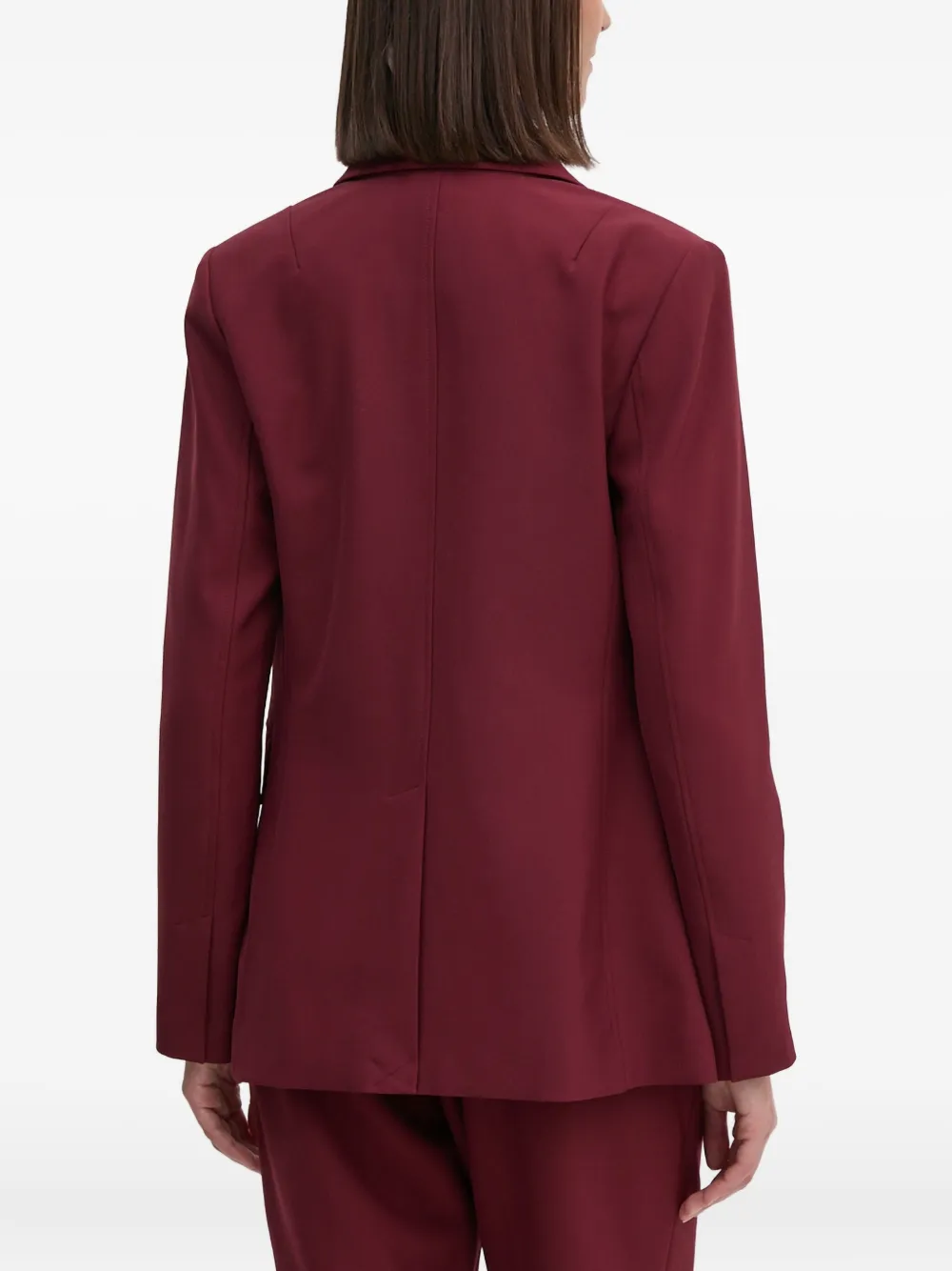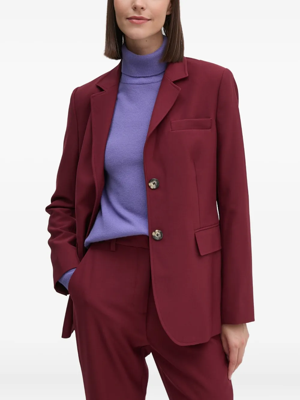 Бордовый цвет, лацканы с вырезом, застежка на пуговицы спереди, передние прорезные карманы с клапанами, длинные рукава, прямой подол