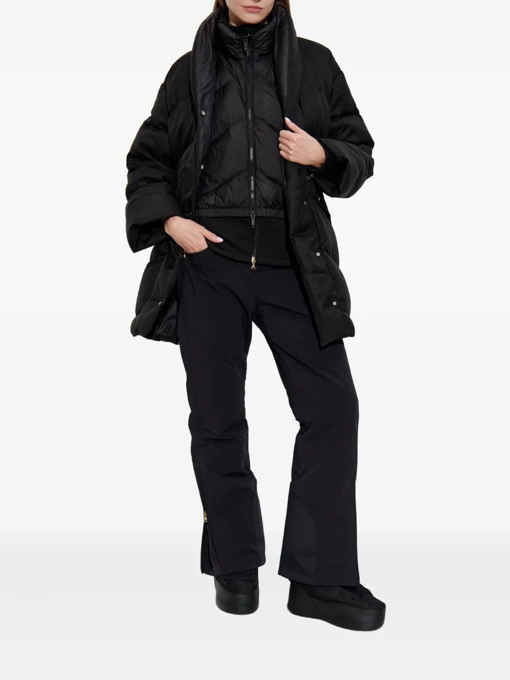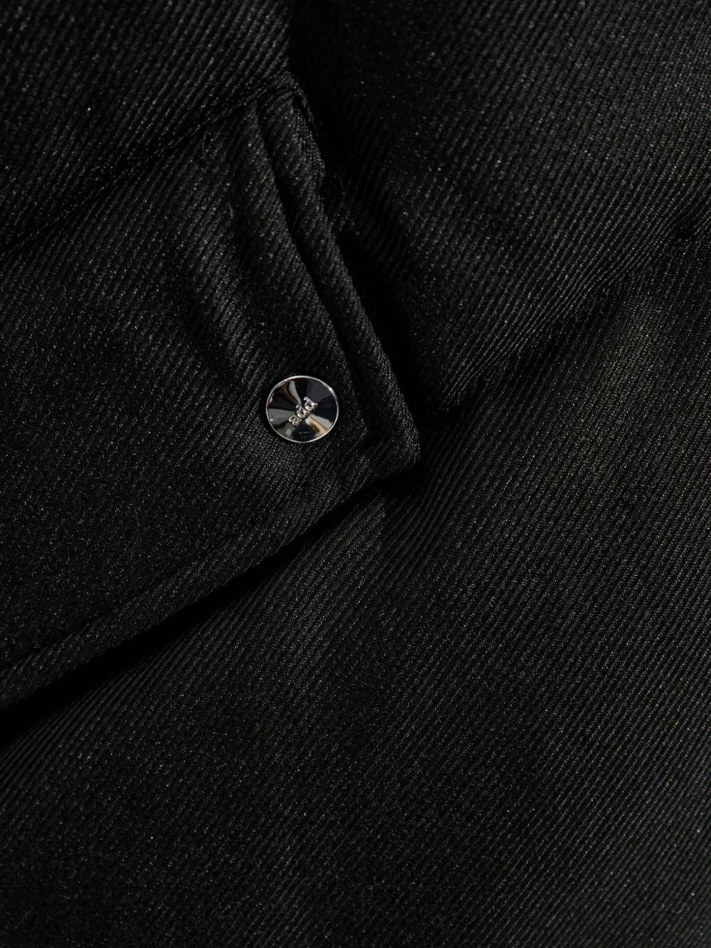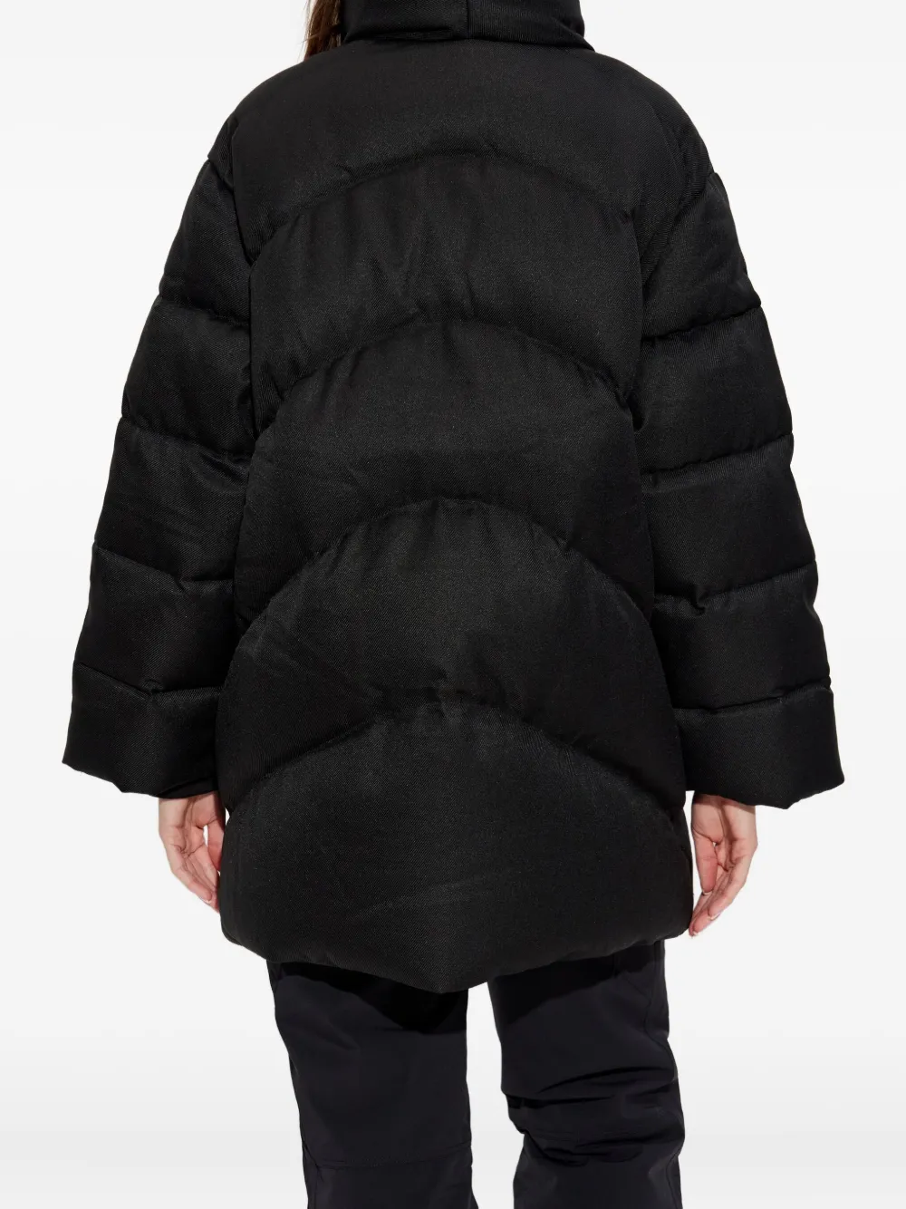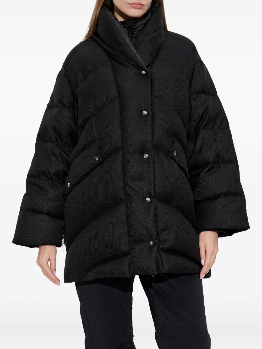 Черная пуховая куртка, застежка на пуговицы, высокий воротник, боковые карманы, молния на манжетах