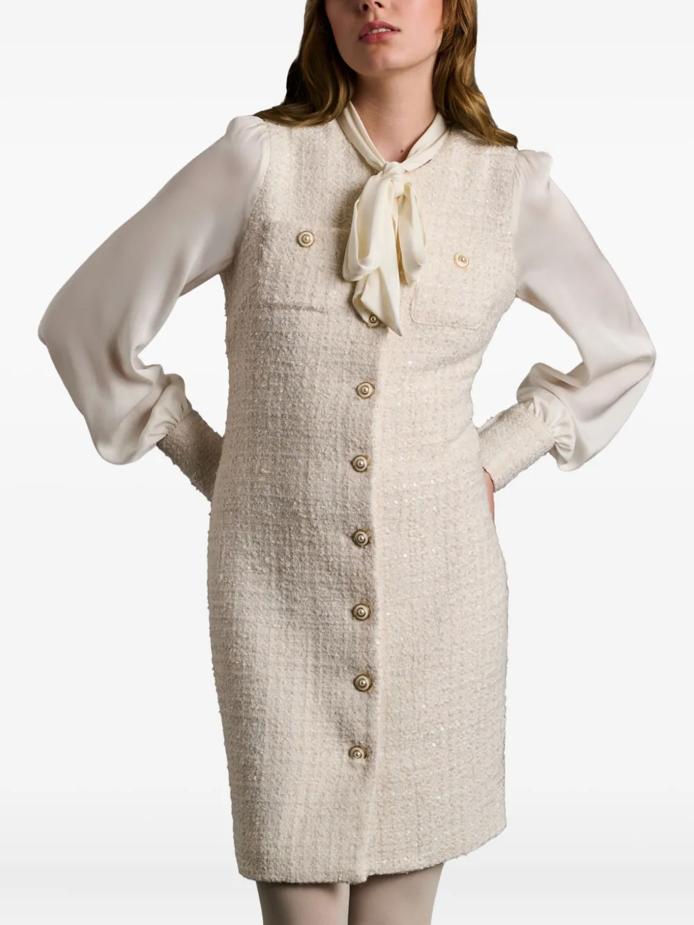 Экрю, эффект твида, блузка с бантом на воротнике, застежка на пуговицы, длинные рукава, нагрудные карманы