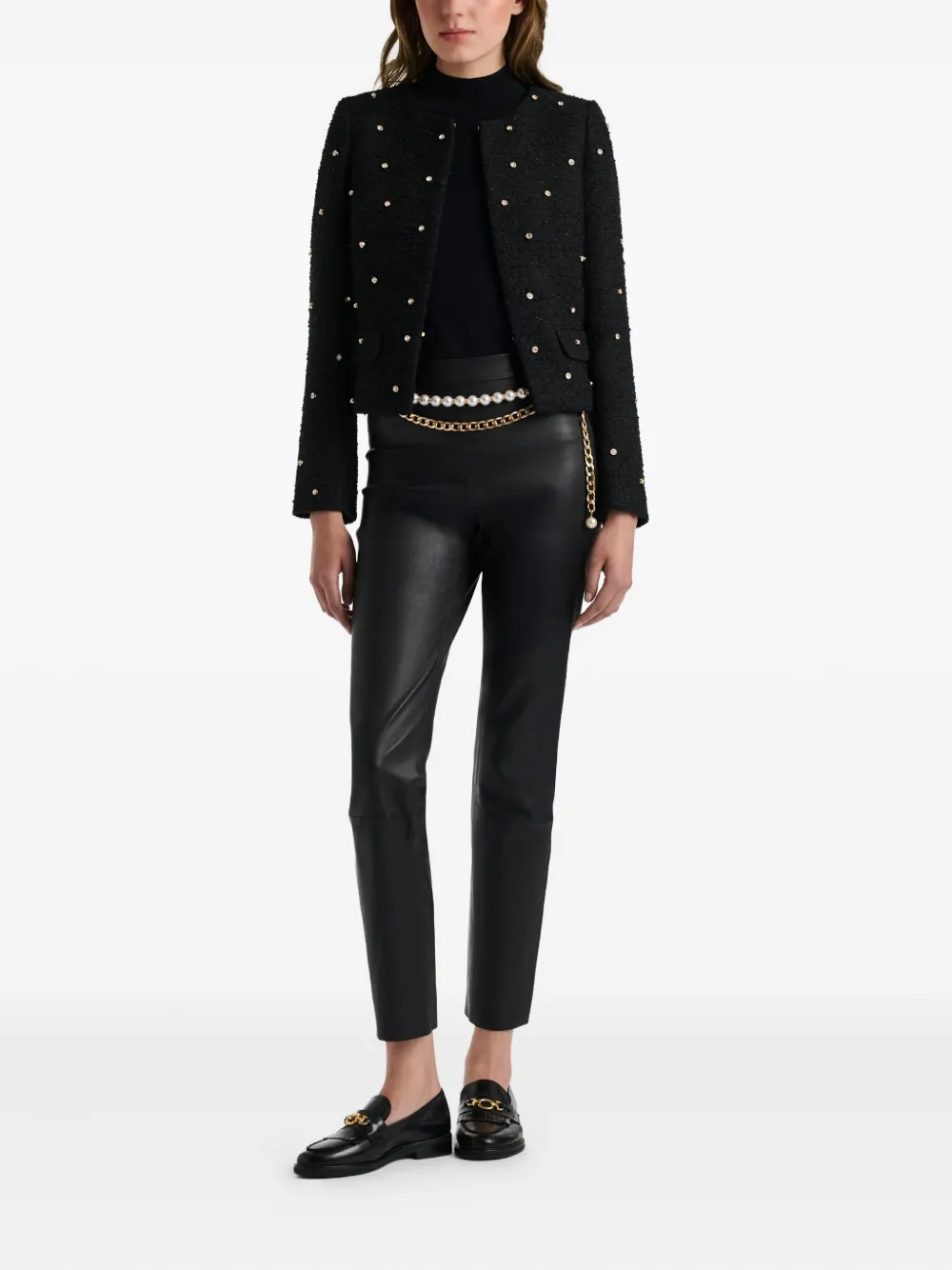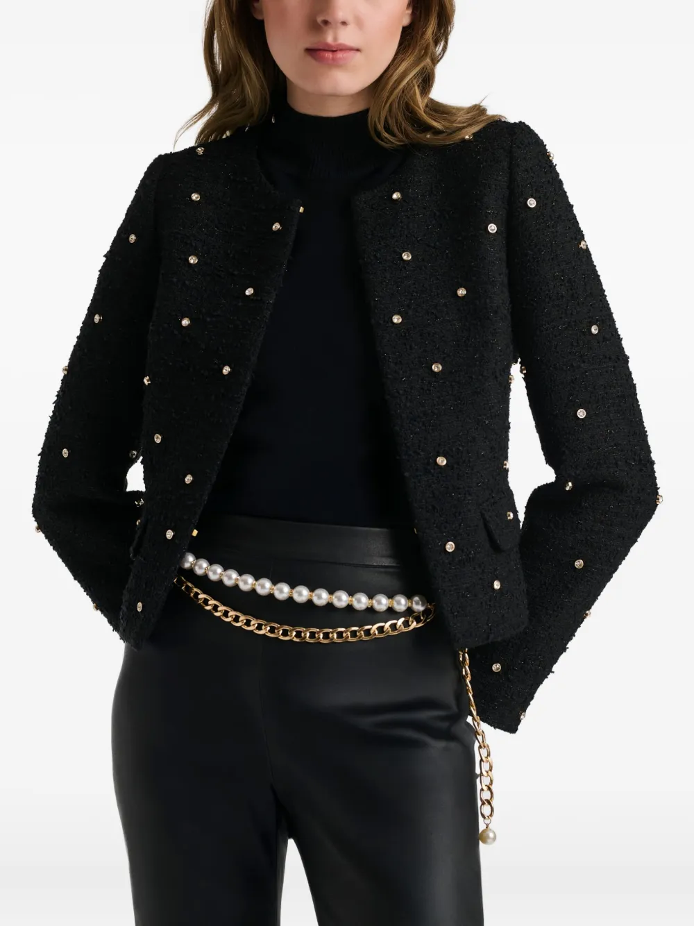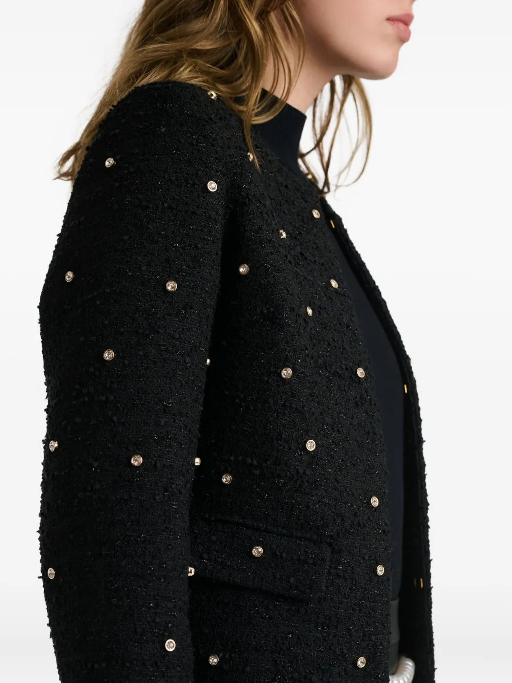 Черный твид, текстура, украшение стразами, круглый вырез, застежка-петли, передние карманы, длинные рукава