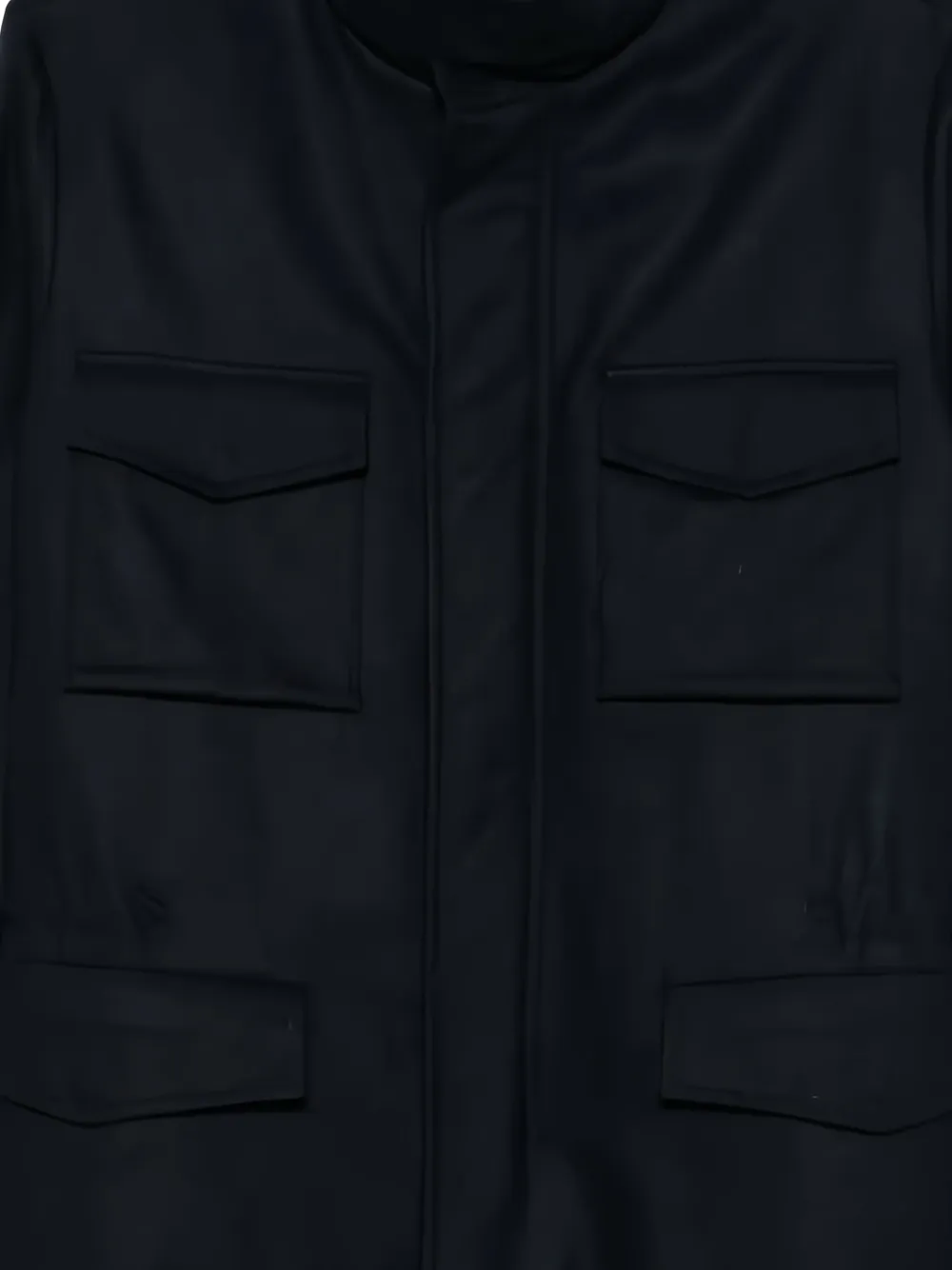 Темно-синий цвет, воротник-воронка, накладные карманы спереди, длинные рукава, застежка на пуговицы, прямой подол