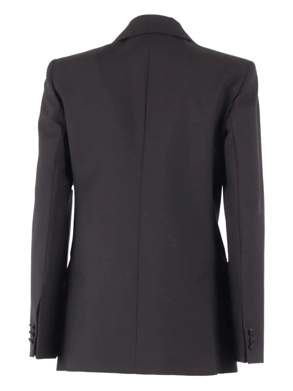 Черный двубортный пиджак с острыми лацканами, передними клапанными карманами, застежкой на пуговицы, длинными рукавами