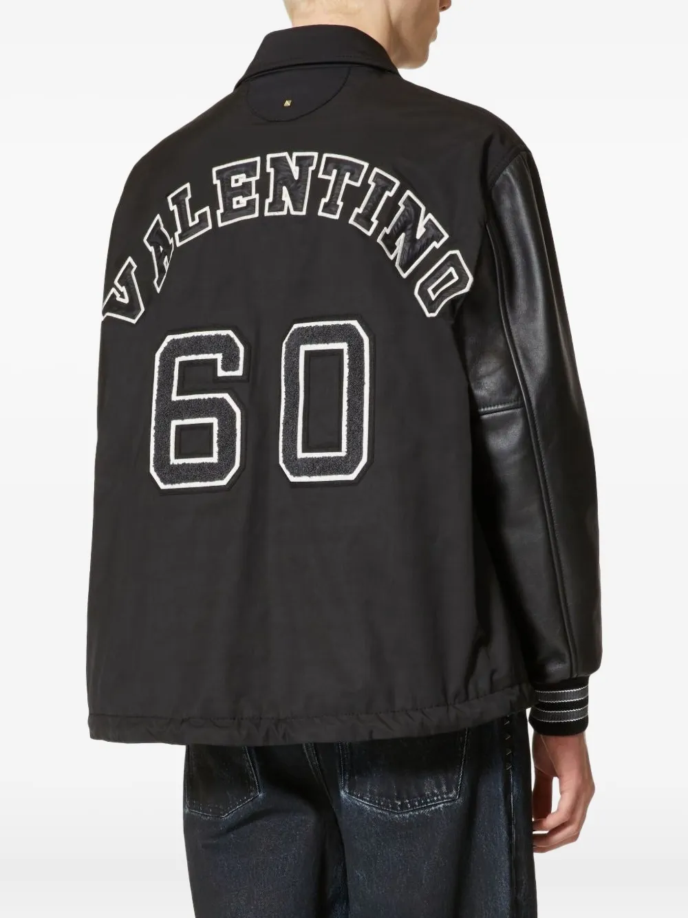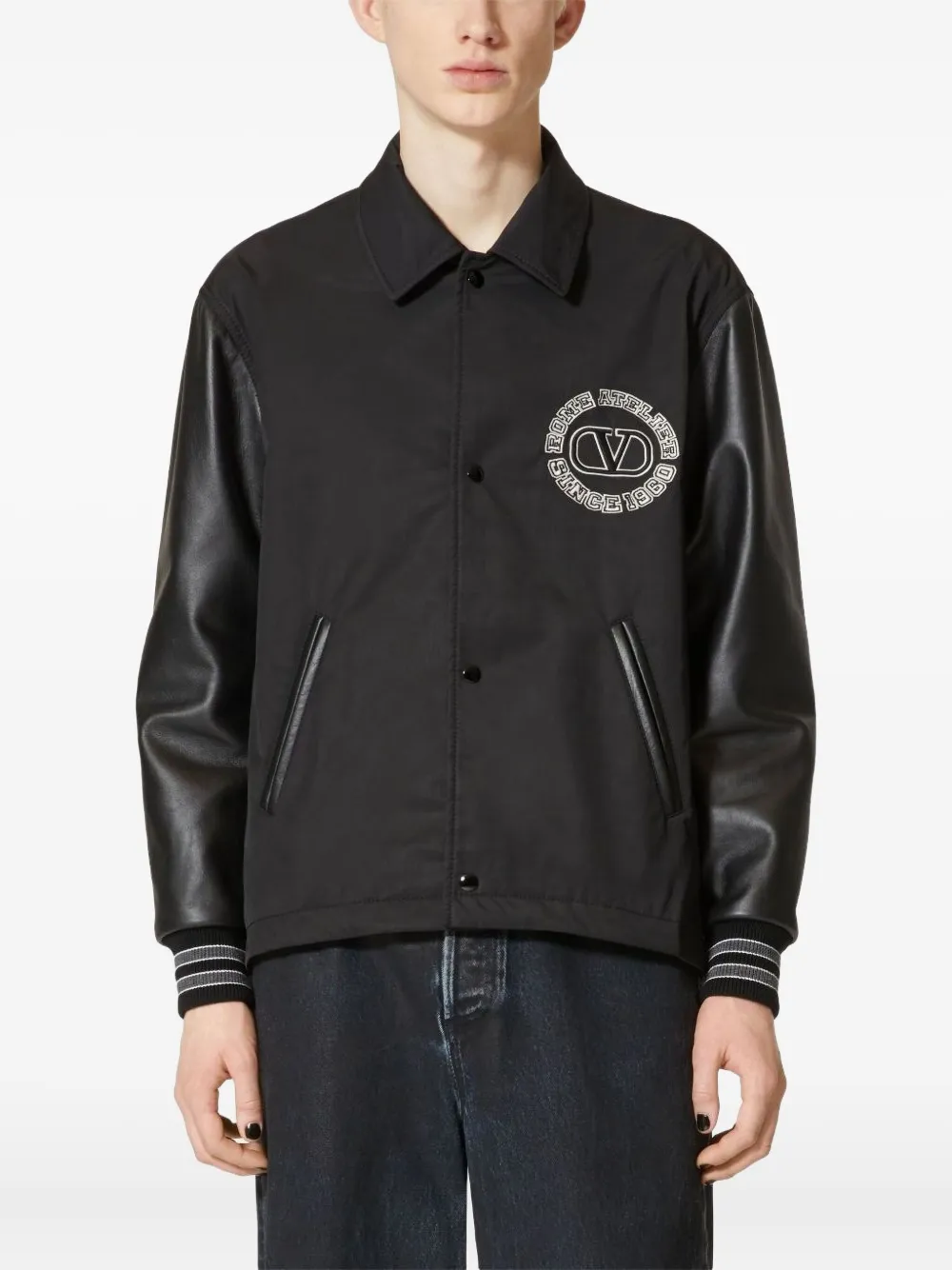 Черный, хлопок/кожа, логотип спереди, принт с логотипом сзади, классический воротник, застежка на кнопках спереди, два кармана по бокам, длинные рукава и прямой подол. Коллекция Valentino Ready To Wear. Образ включает аксессуары Valentino Garavani.