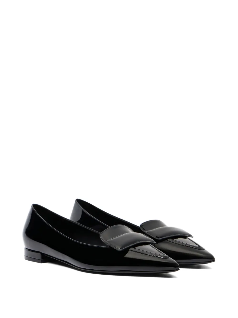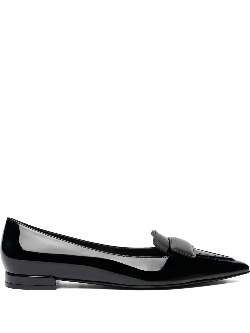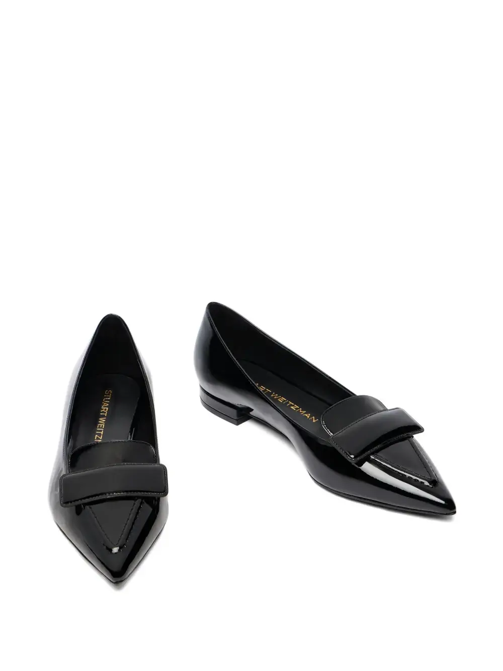 Черные лаковые туфли с заостренным носком на плоской подошве